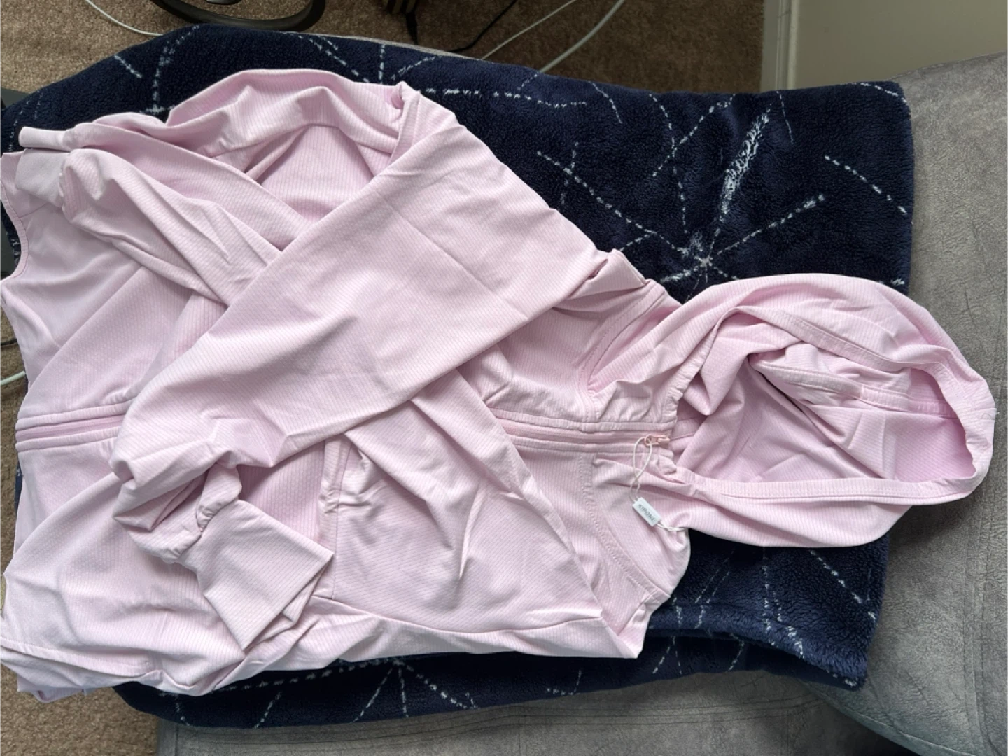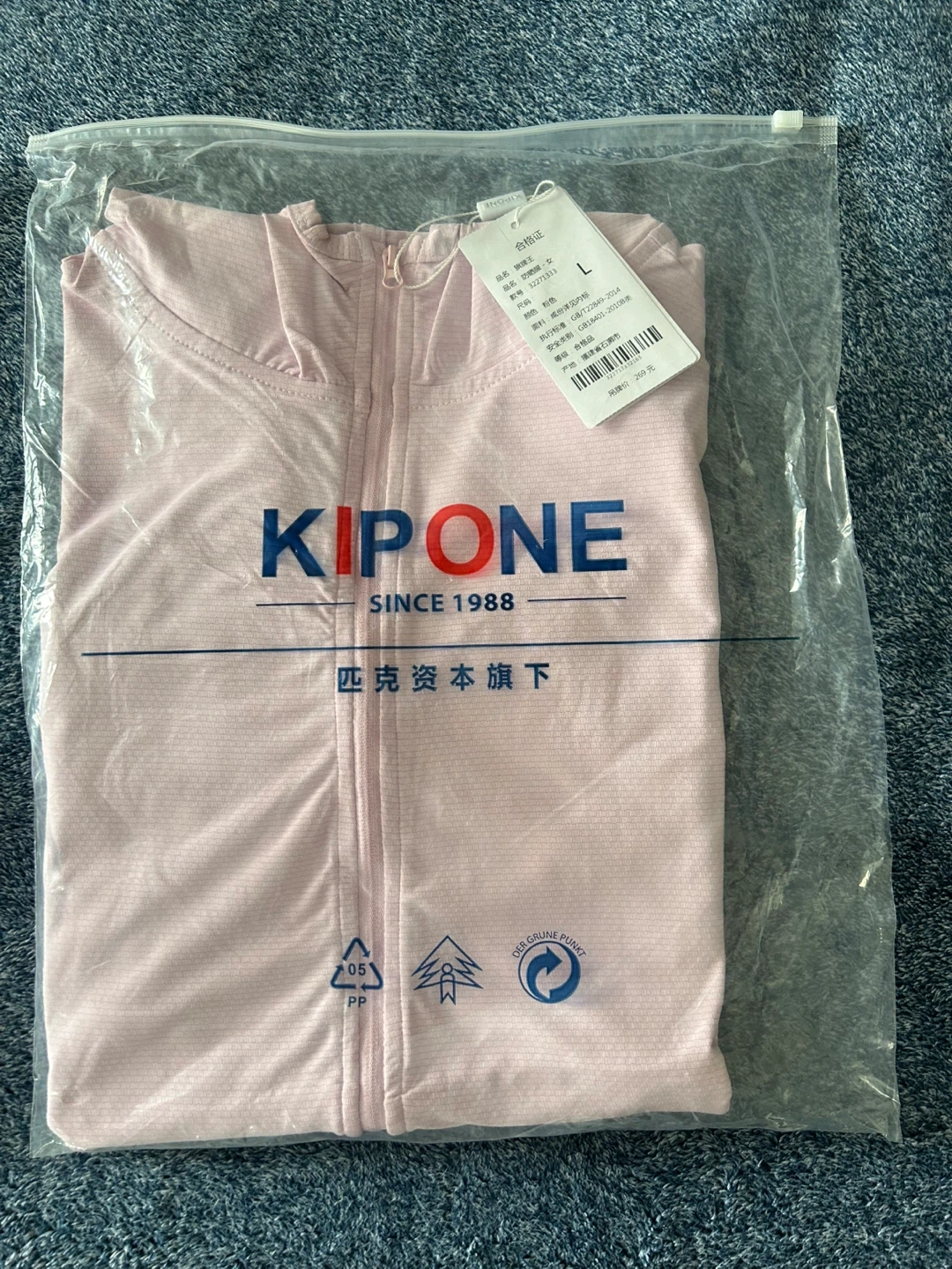 This is a pink hooded zip-up jacket from Kipone. It's a size M. The jacket is made of a lightweight, breathable material. It's suitable for light workouts or casual wear.SPF50
