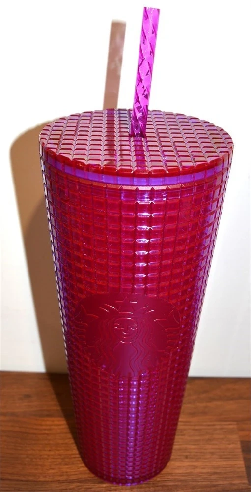 This reusable Starbucks tumbler is a fun way to enjoy your favourite drinks. It's made of durable plastic with a textured grid design. Includes a matching straw. Perfect for cold beverages on the go!