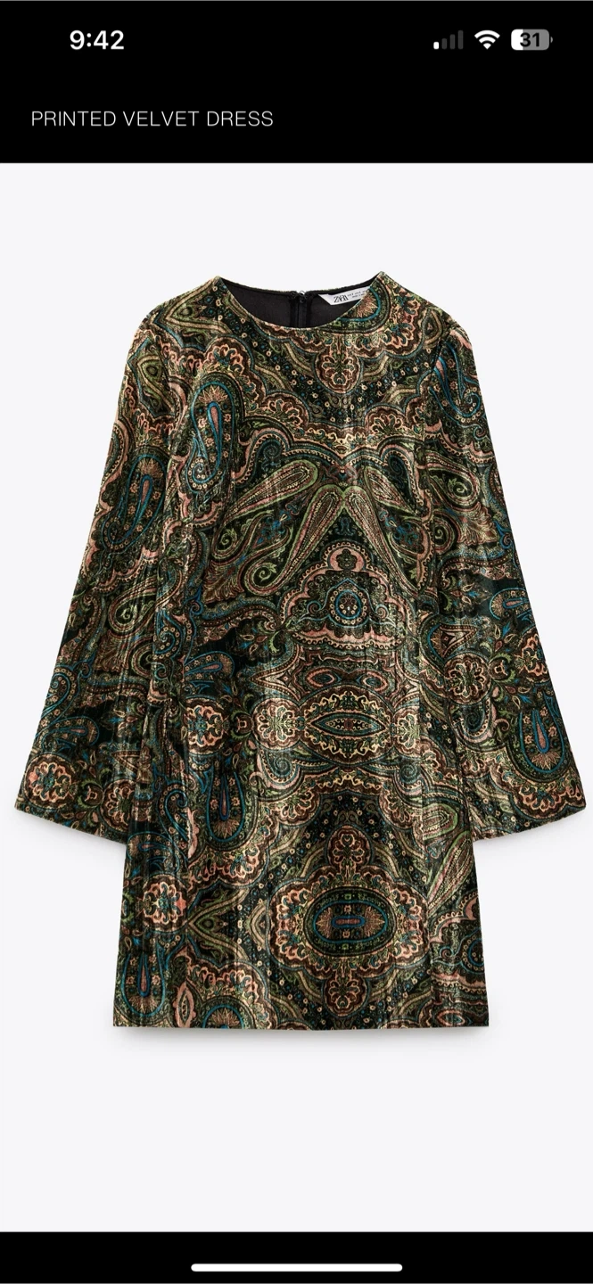 Selling a Zara printed velvet dress! It features a beautiful paisley print and a comfortable velvet material. Tight fitting. This dress is perfect for a night out or a special occasion like near year. Never warn. Moving from canada so downsizing.