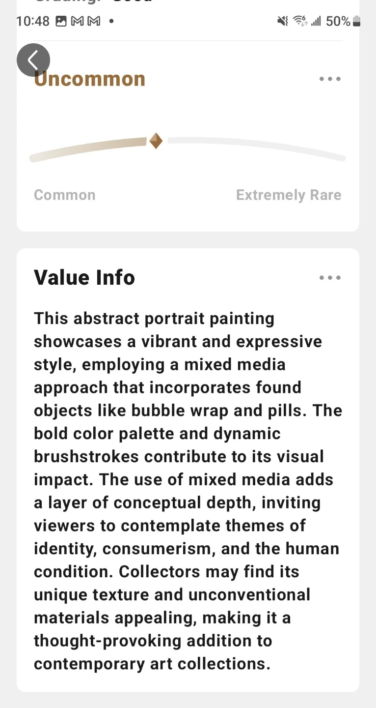 This abstract portrait painting uses mixed media with a bold colour palette and dynamic brushstrokes. Found objects like bubble wrap and pills are incorporated into the artwork. It's an expressive piece that offers a unique texture and unconventional materials.