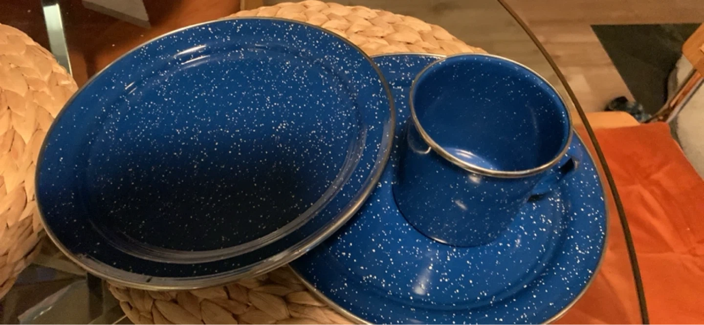 This set includes a blue speckled enamel plate and a matching cup. Both pieces have a silver rim detail. Great for camping trips or casual outdoor dining!