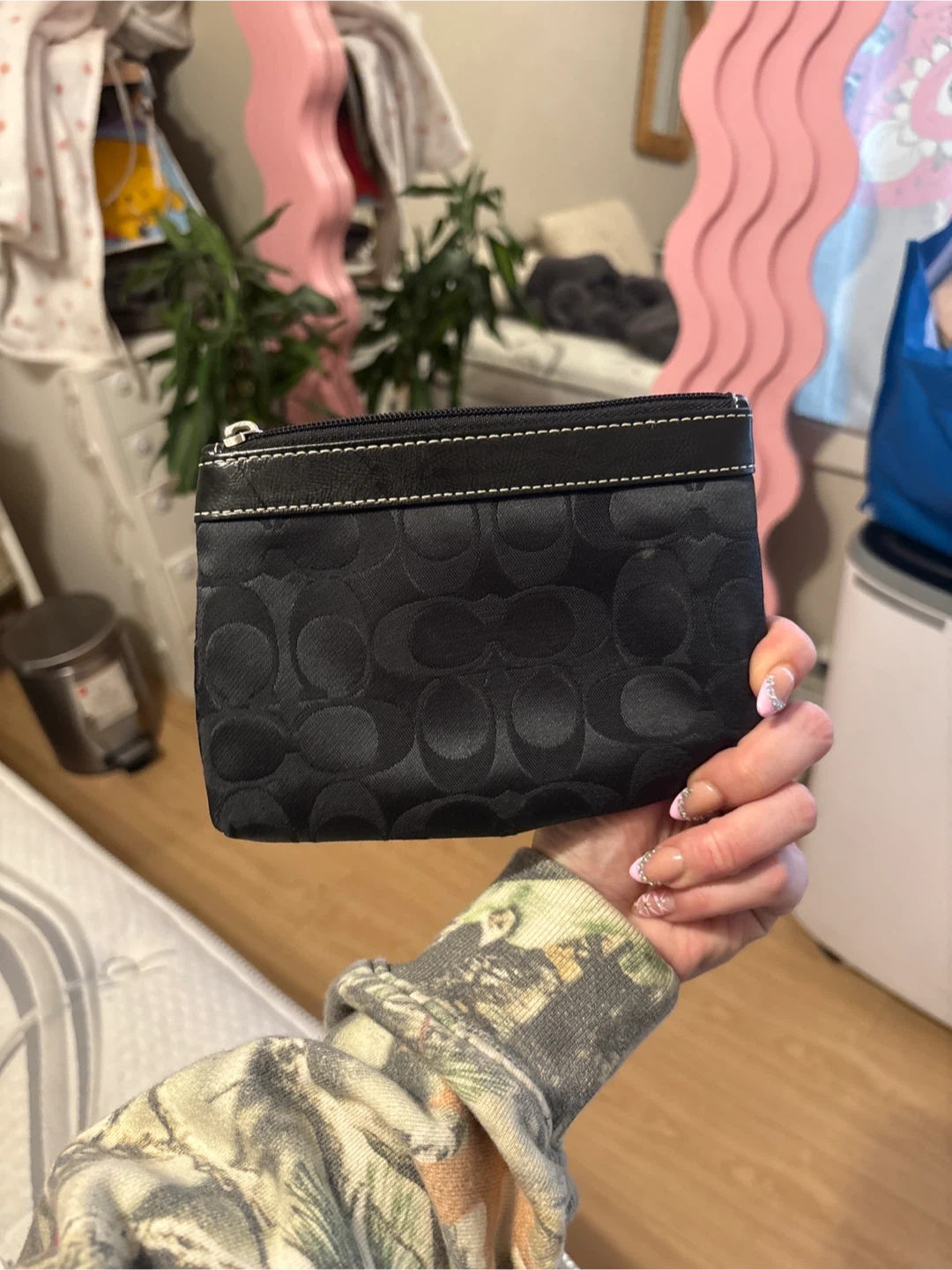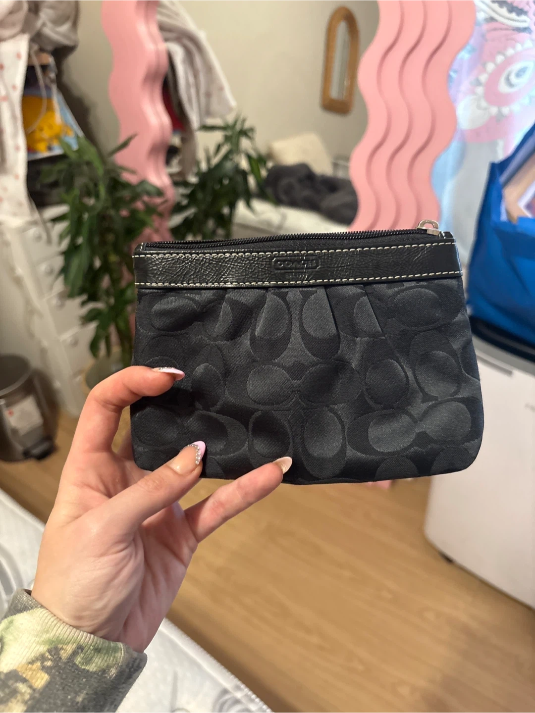 This is a black Coach pouch wristlet with the signature C pattern. It has a zip closure and a small loop attached to the zipper pull. It's a compact size, perfect for holding essentials like cards, cash, or keys.