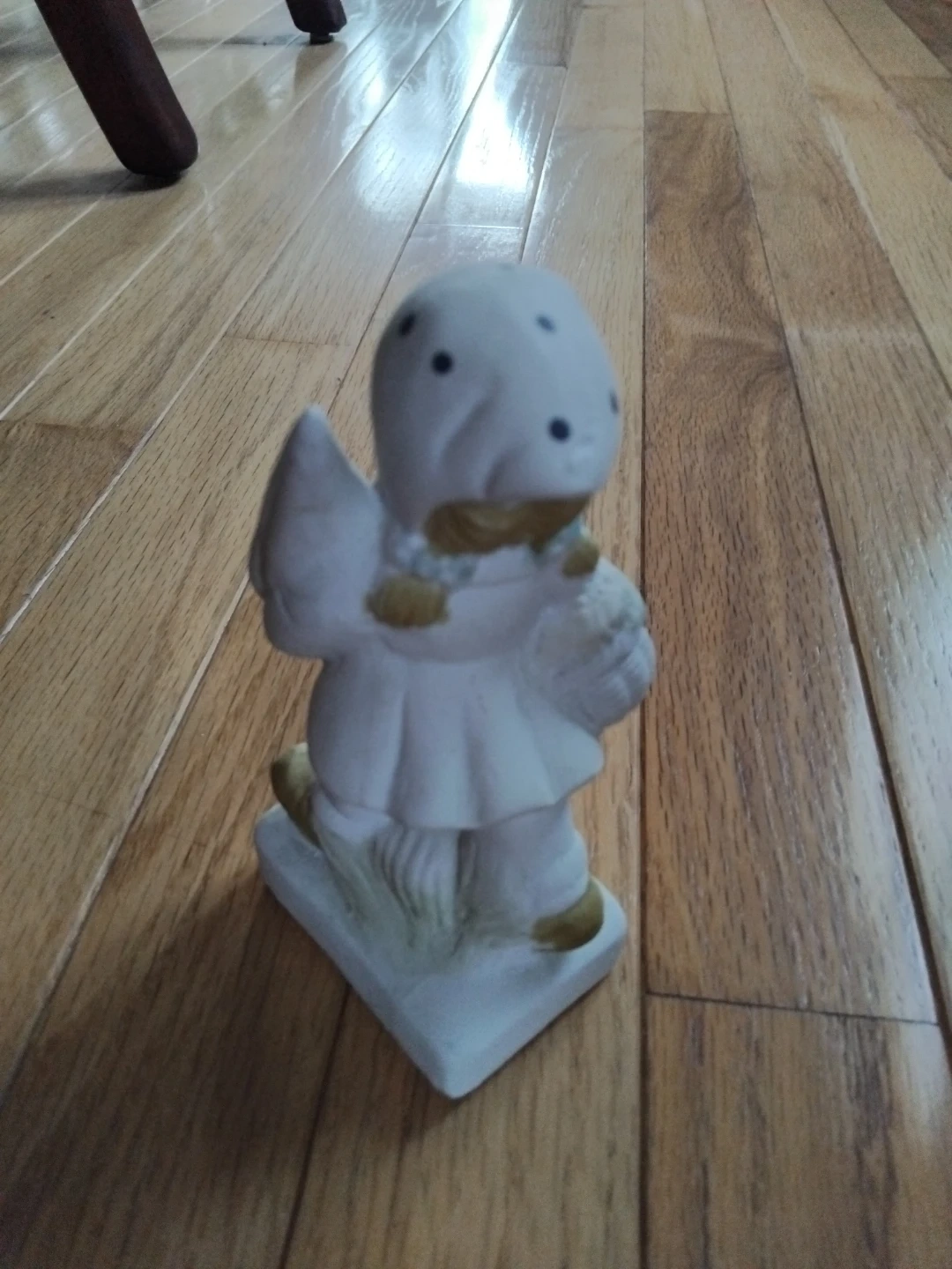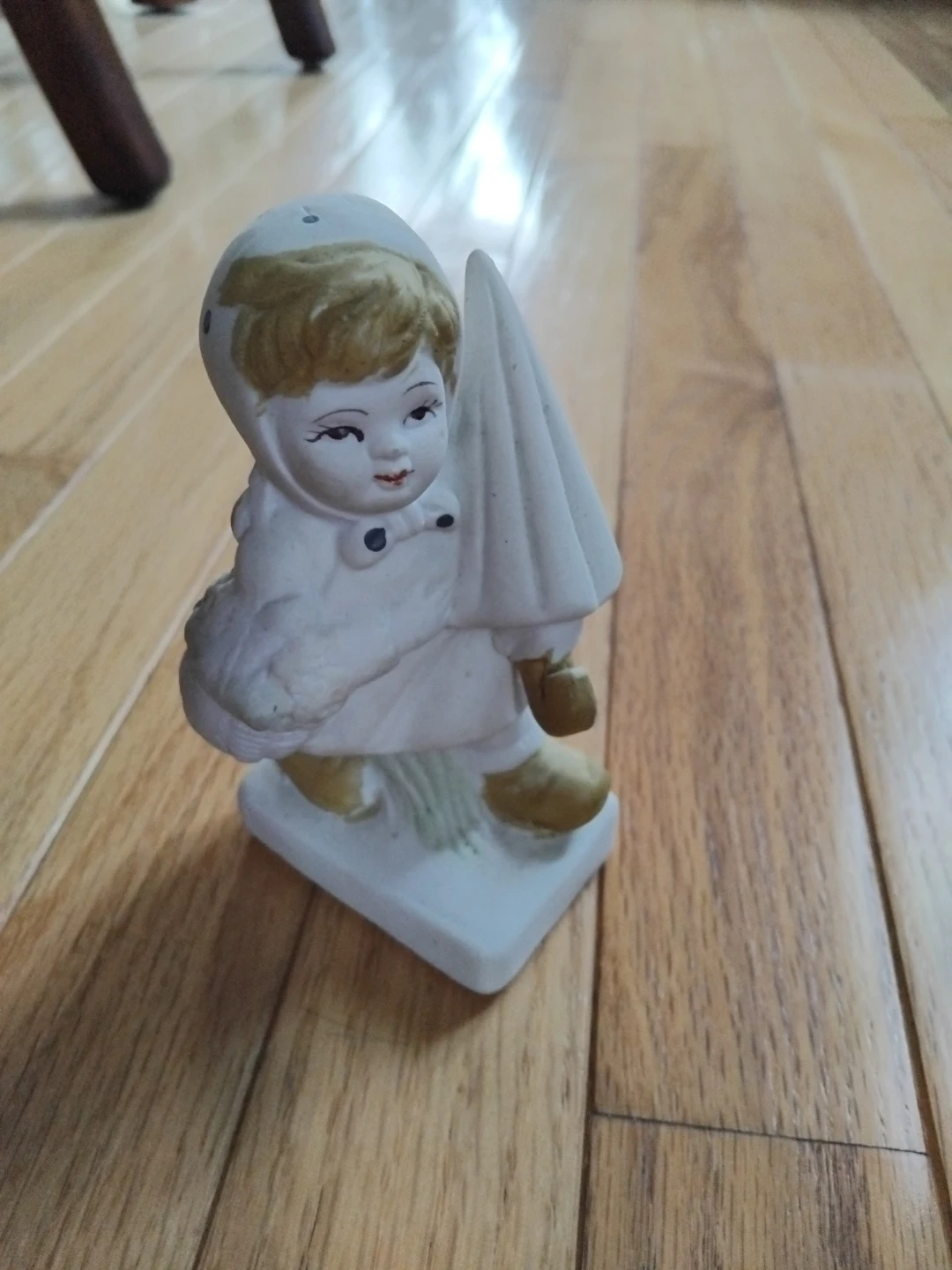 This is a charming ceramic figurine depicting a young girl holding an umbrella and a basket. It's a lovely decorative piece. This item is made of ceramic.
