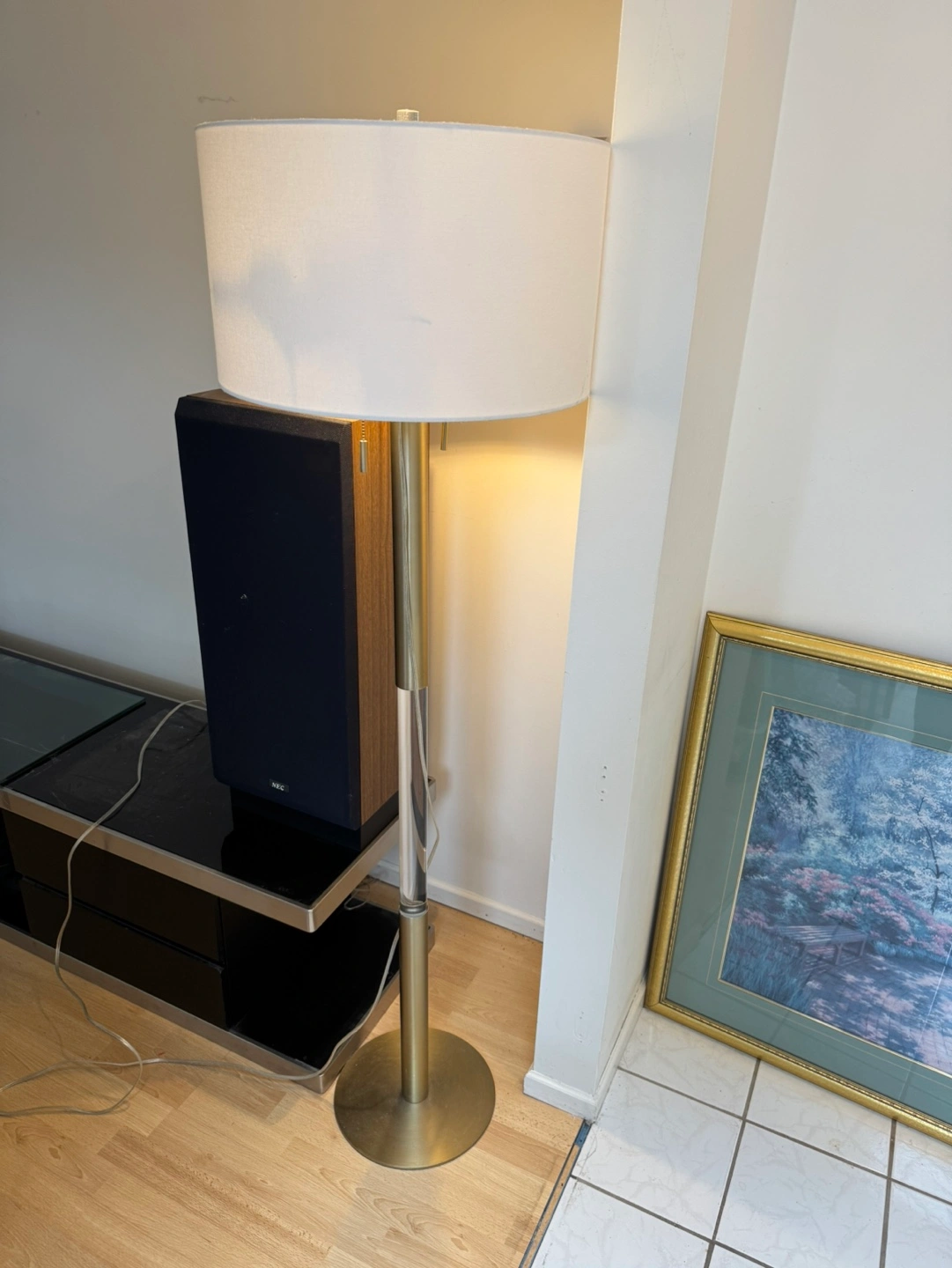 Tall floor lamp, brass coloured base and accents, clear acrylic centre column, off-white drum shade. Excellent for living room or bedroom.