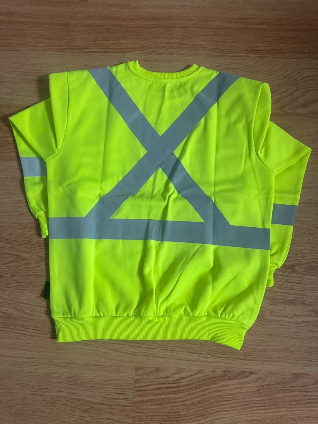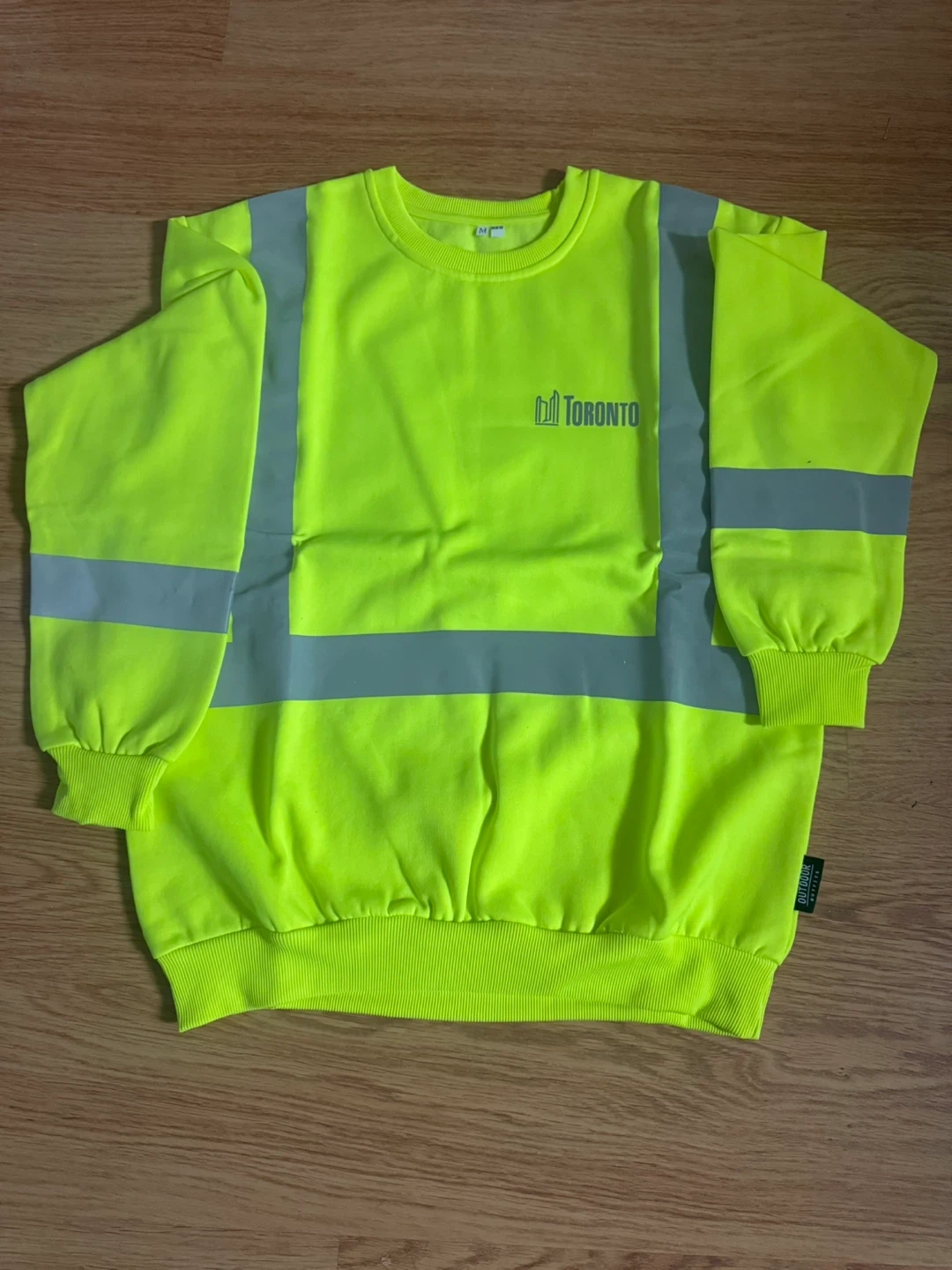 High-visibility neon safety sweatshirt with reflective tape. It's a crew neck style with ribbed cuffs and hem. City of Toronto branding is visible on the front.