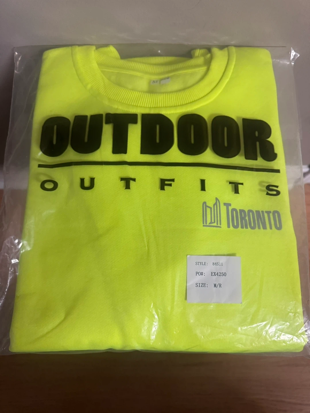 High-visibility neon safety sweatshirt with reflective tape. It's a crew neck style with ribbed cuffs and hem. City of Toronto branding is visible on the front.