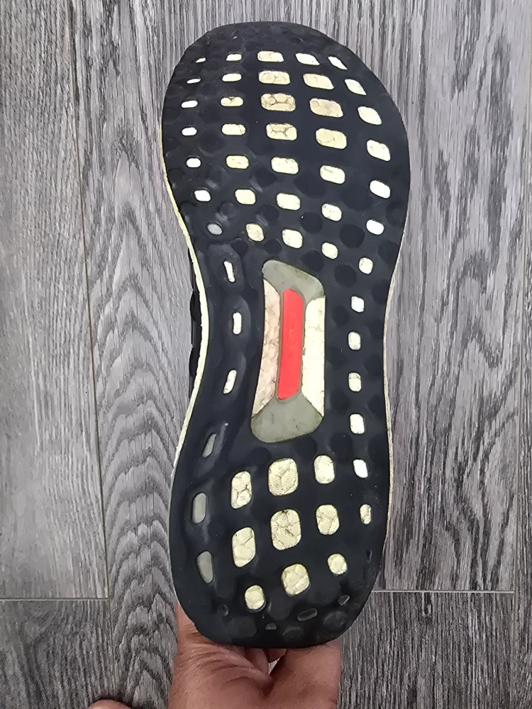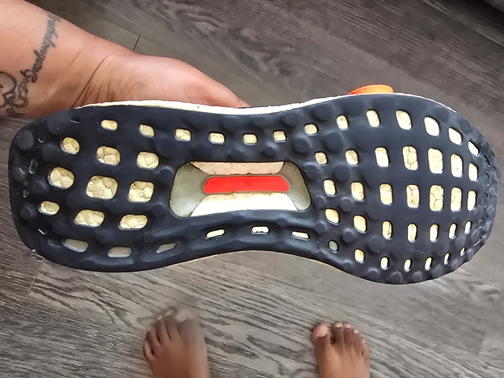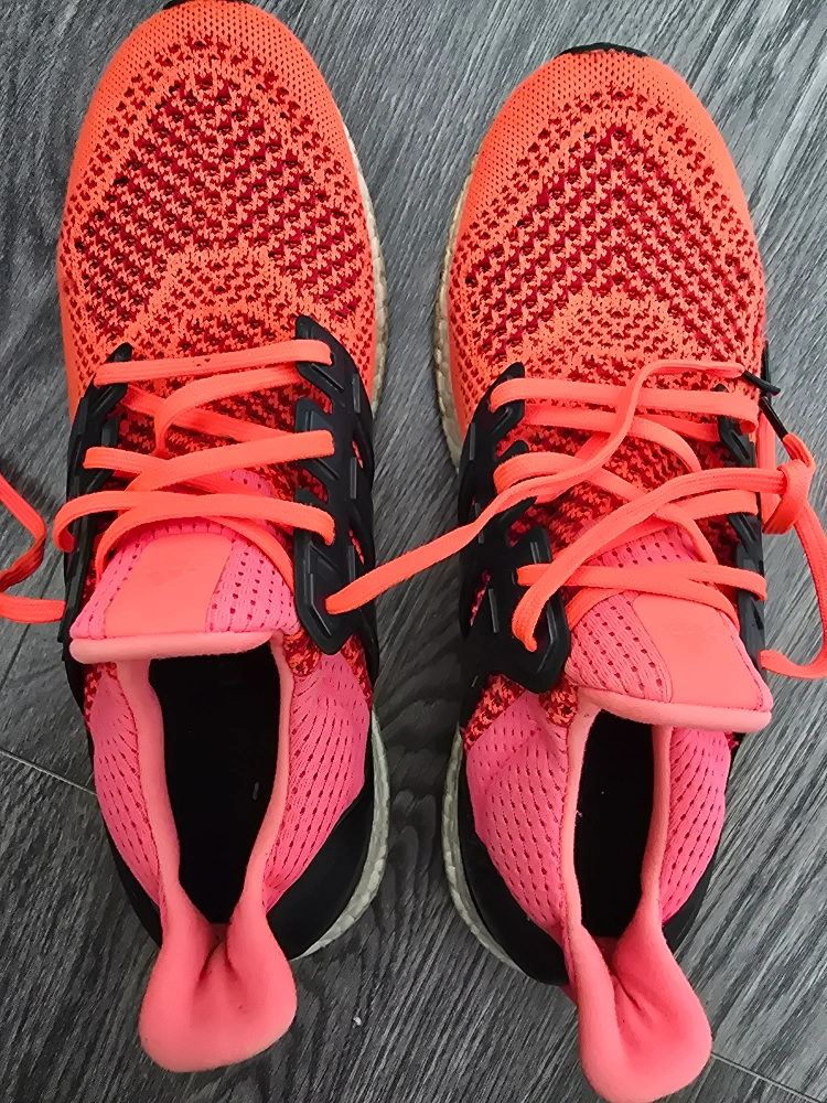 Here are some Adidas Ultra Boost running shoes! They're a vibrant orange colour and ready for your next run. They show minimal signs of wear, but still have lots of life left in them.
