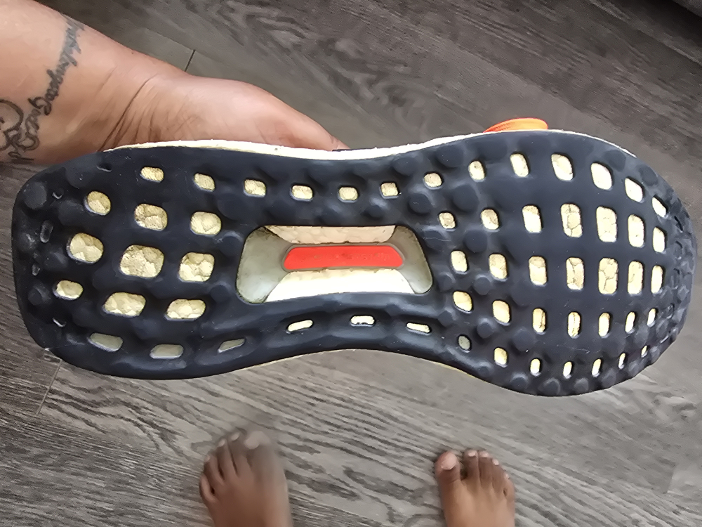 Here are some Adidas Ultra Boost running shoes! They're a vibrant orange colour and ready for your next run. They show minimal signs of wear, but still have lots of life left in them.