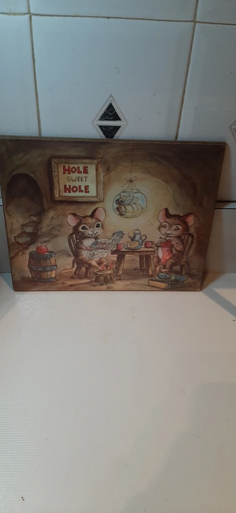This is a cute vintage print featuring mice in a cozy home setting. 10 X 8. The print says "Hole Sweet Hole" above the scene. It would be a charming addition to any room. $1. Yes it's available if you see the ad up. FCFS. Cash only.