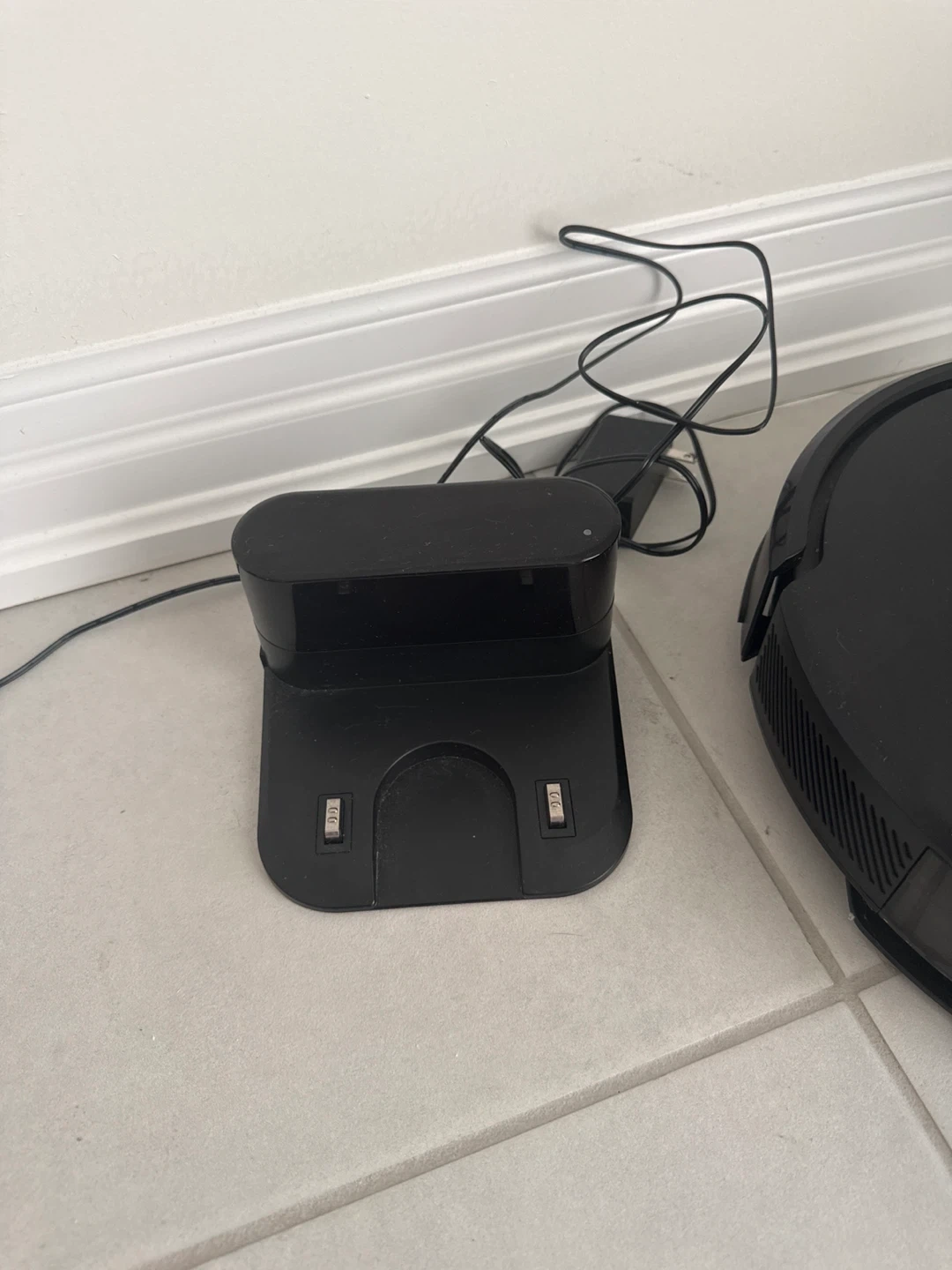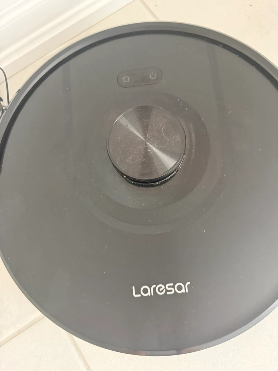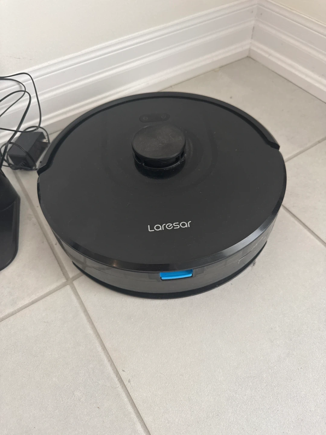 This is a black Laresar robot vacuum cleaner. It comes with its charging dock and power adapter. It's designed to automatically clean floors.