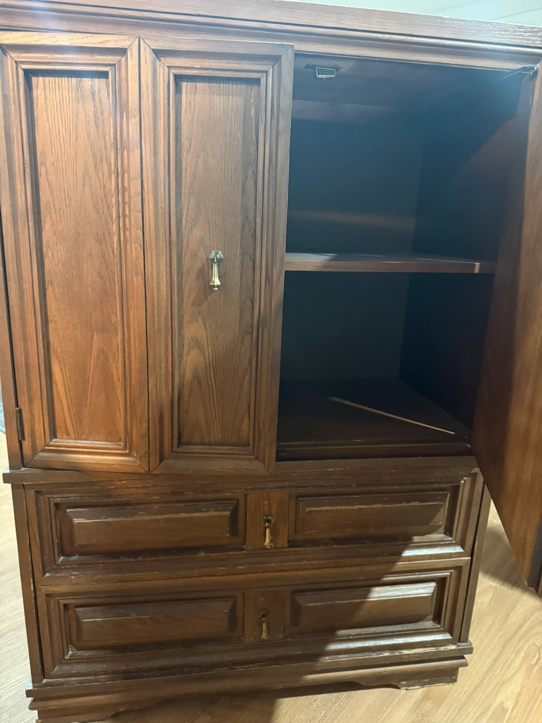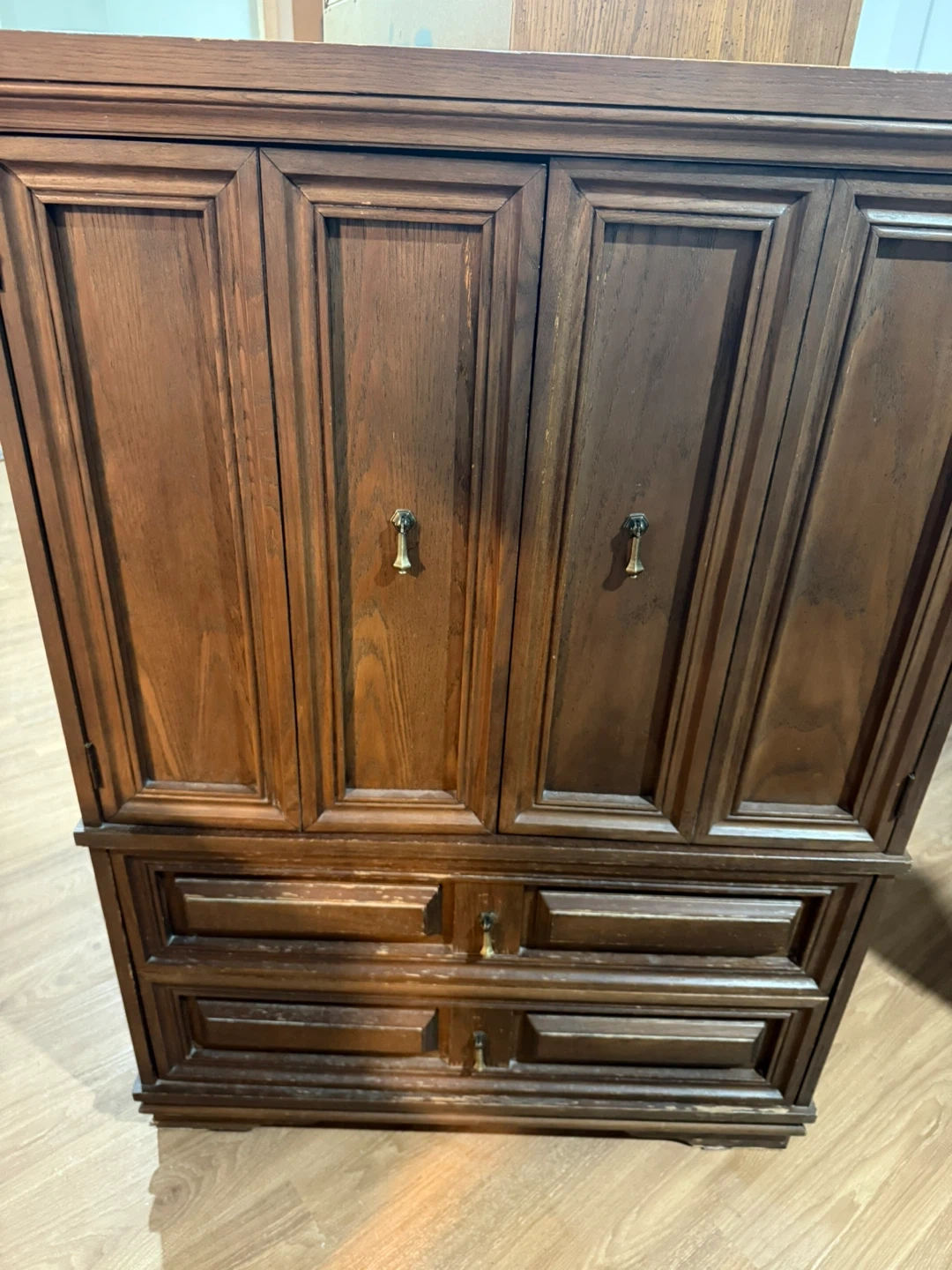 This is a beautiful, dark wood armoire with a classic design. It features three drawers at the bottom for storage. The upper section has double doors that open to reveal shelves. Great for bedrooms or living areas!