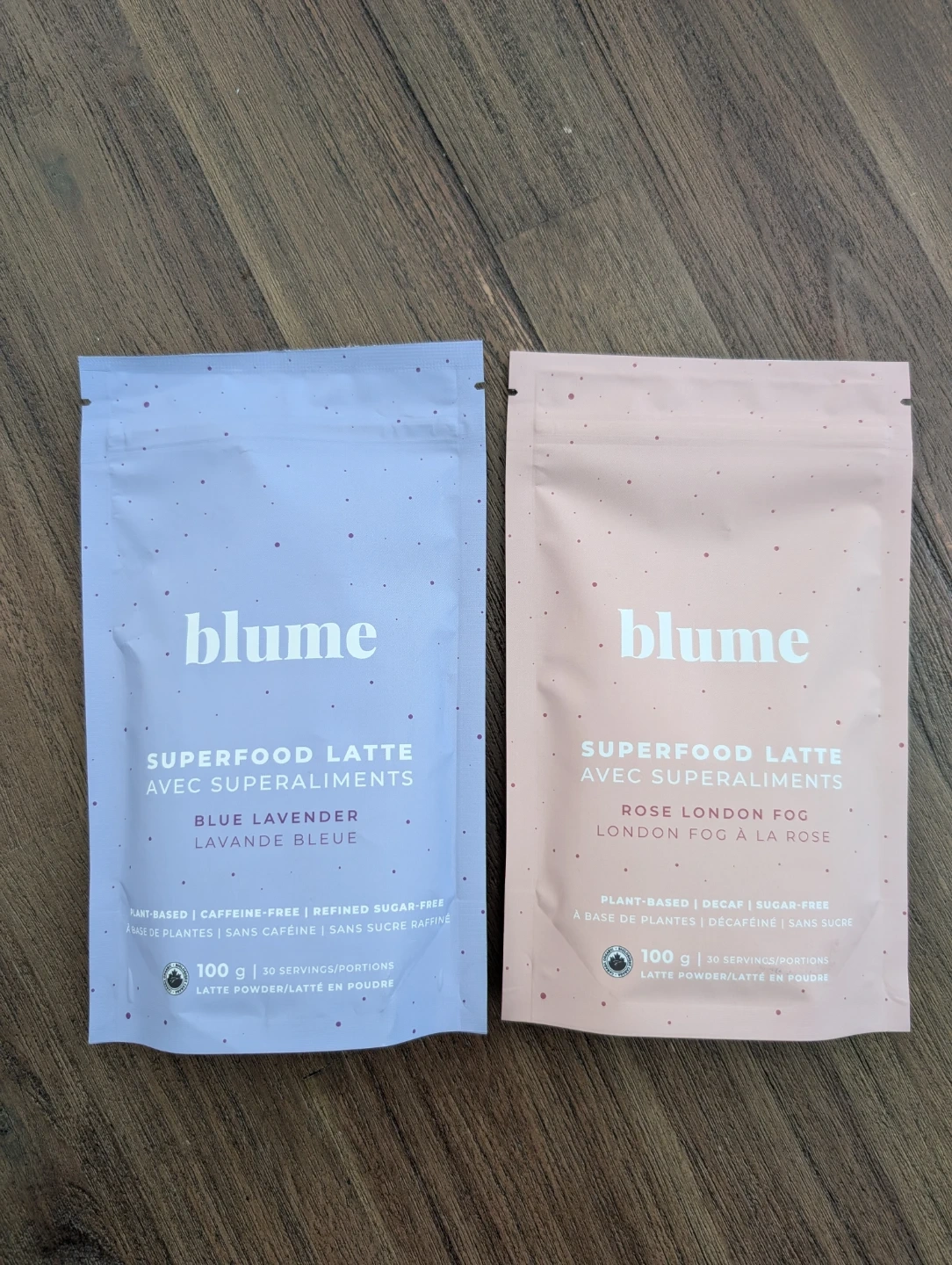 Brand new sealed Blume Superfood Latte Mix: Blue Lavender and Rose London Fog. Each bag contains 100g and is plant-based.