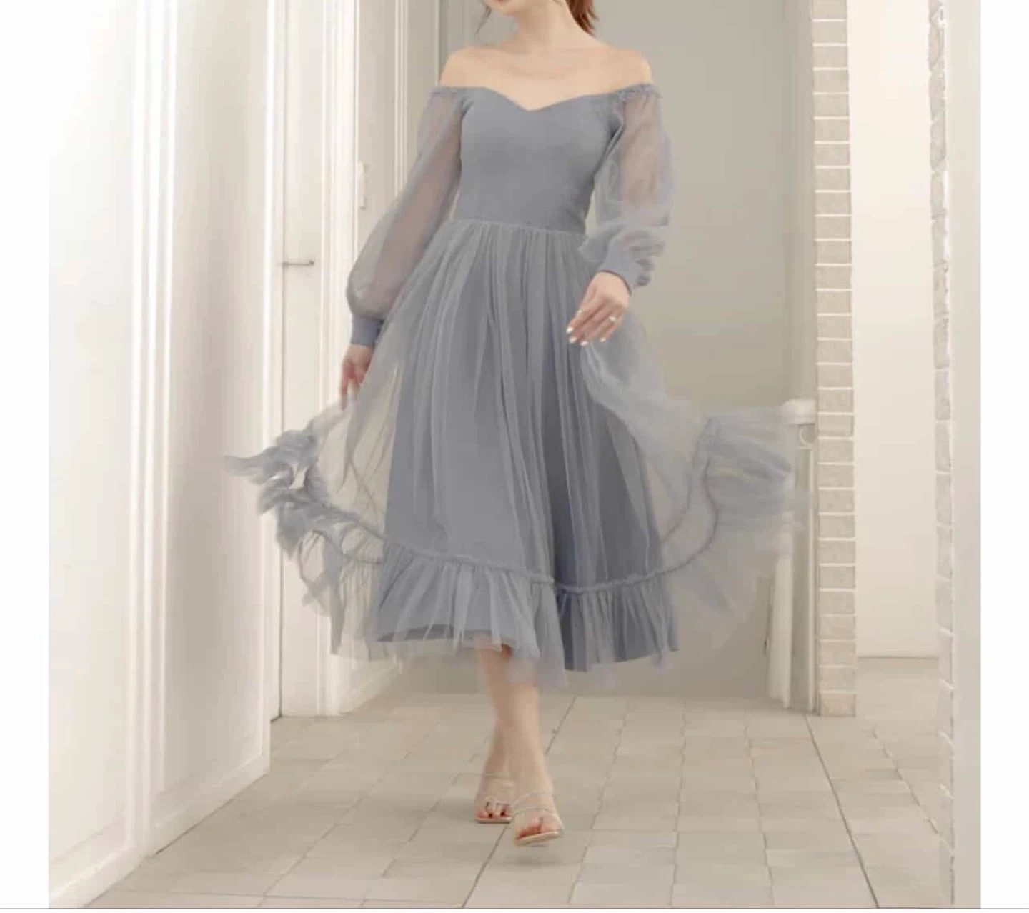 A lovely blue off-shoulder dress with a tulle skirt! The dress features sheer, long sleeves and a ruffled hem. Perfect for a special occasion or a night out