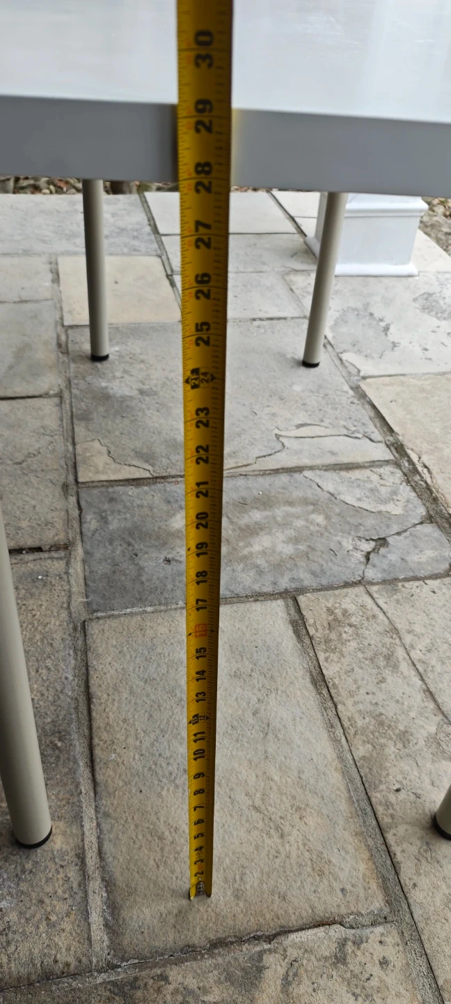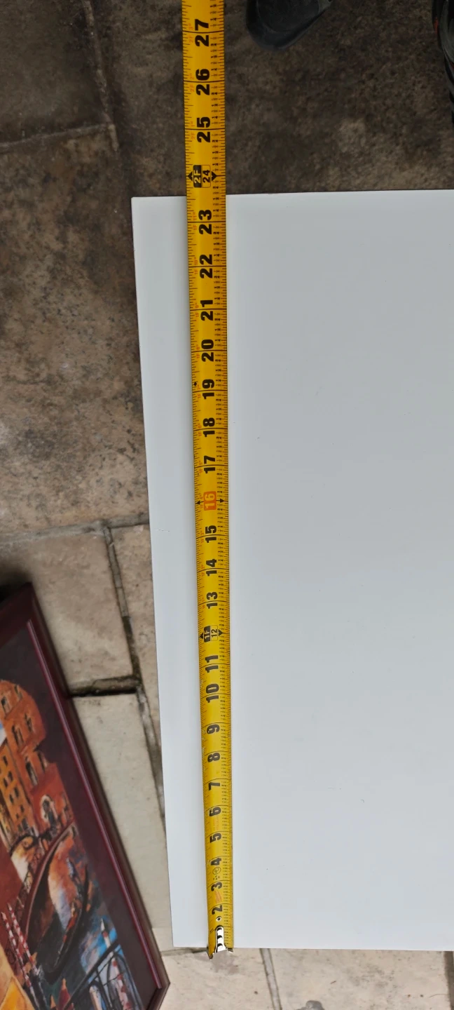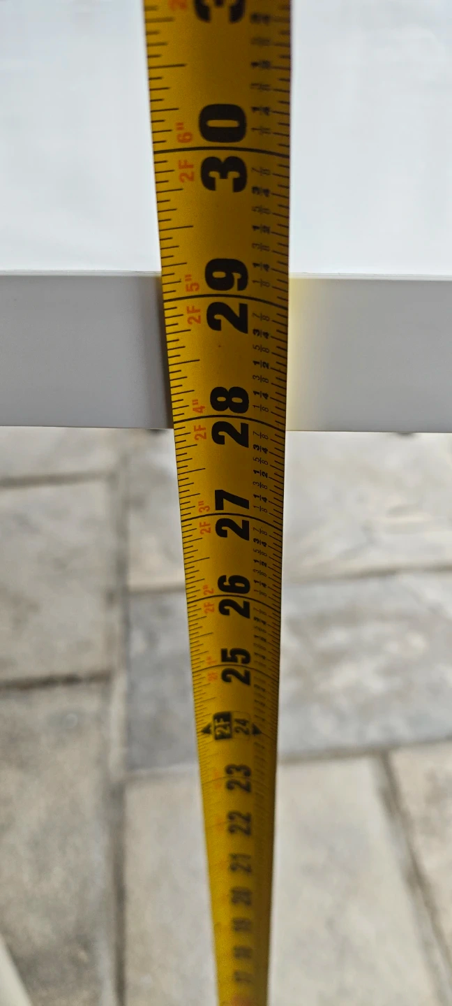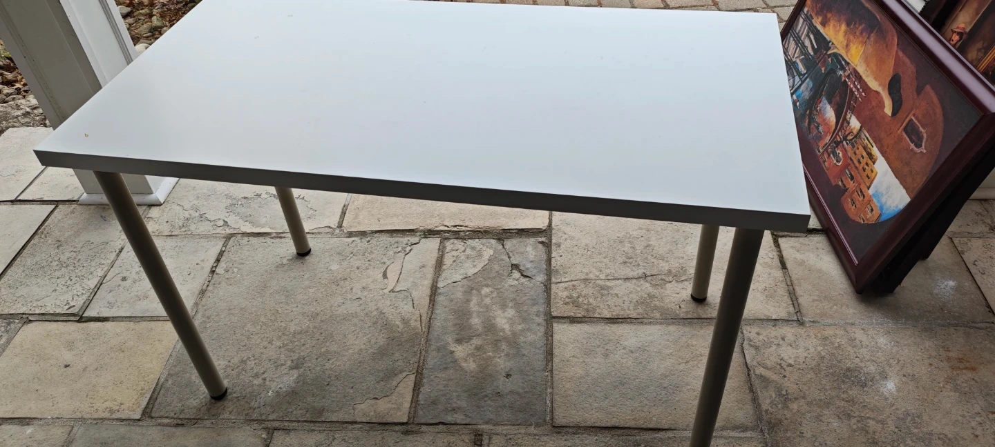 Simple white table with four legs. Tabletop measures 47 inches long and 23.5 inches wide. It stands 29 inches tall. It's a handy surface for various uses.