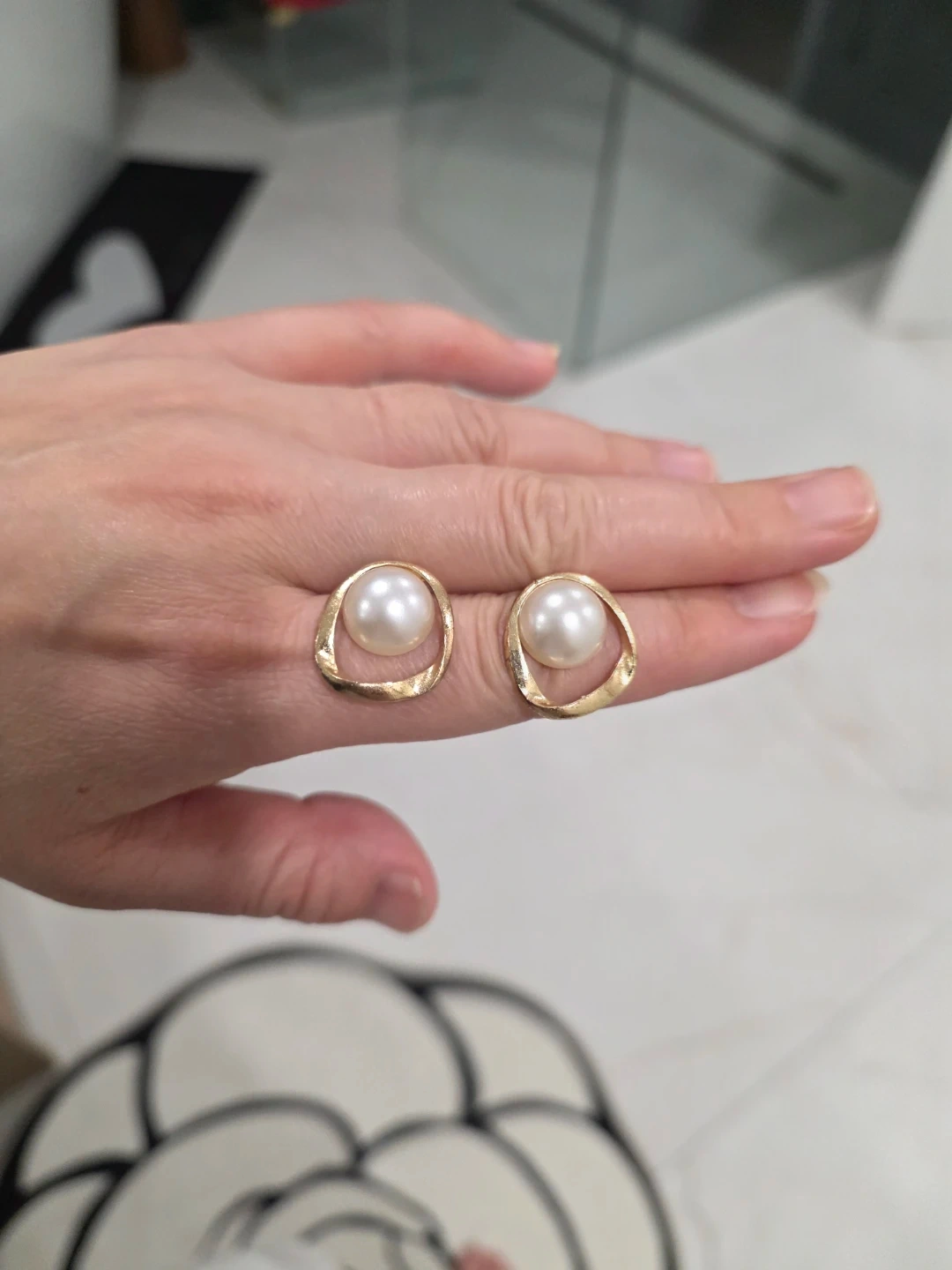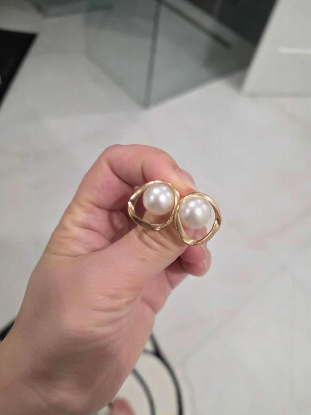 These earrings feature a faux pearl set in a gold-toned abstract frame. They're a classic choice for adding a touch of elegance to any outfit. Great for everyday wear or dressing up for a special occasion!