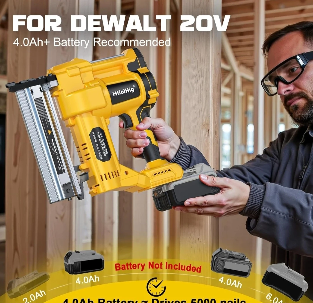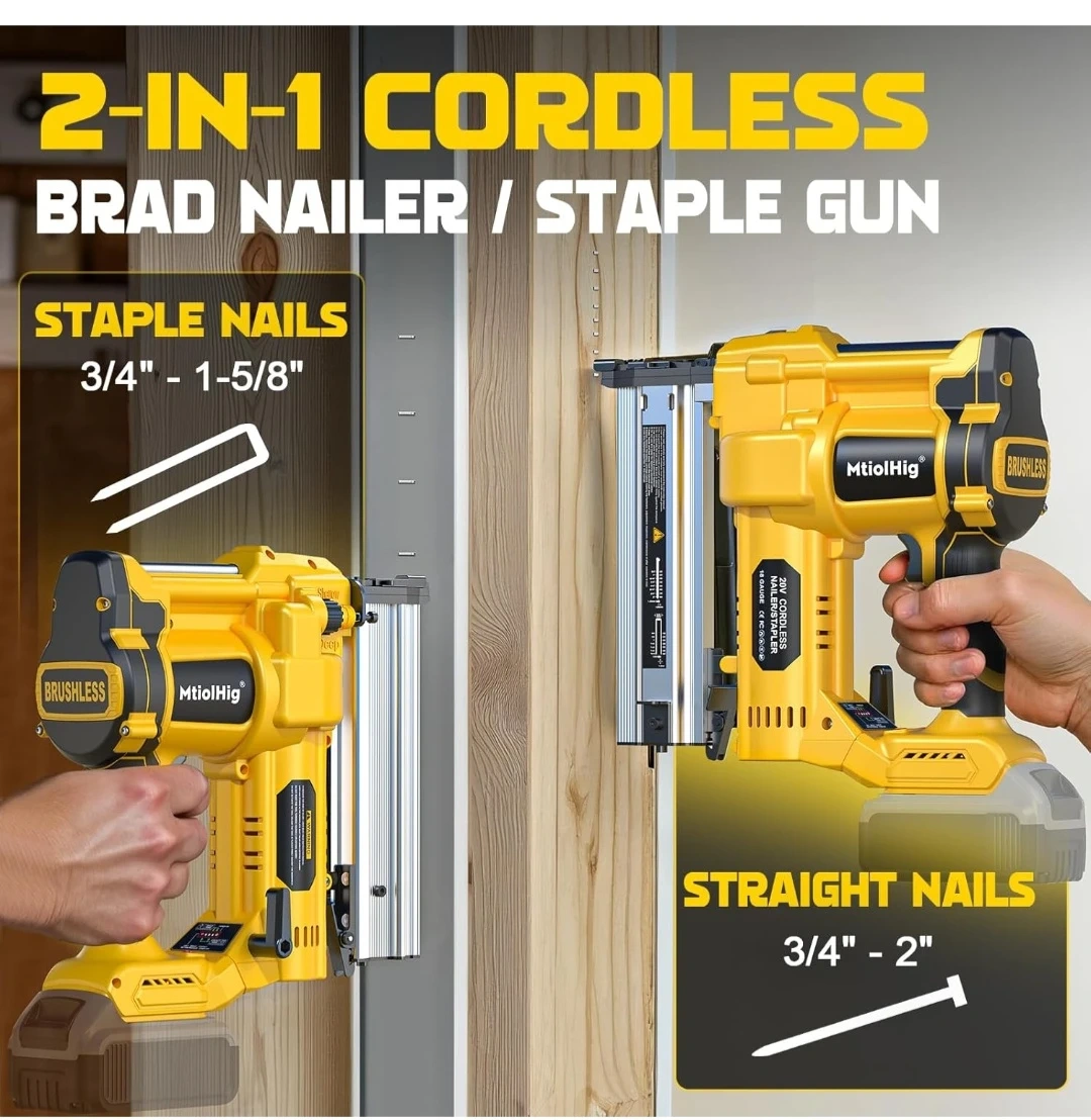 This MtiolHig 2-in-1 cordless nailer works as both a brad nailer and a staple gun. It features adjustable nailing depth and two nailing modes: single fire and contact fire. Straight nails are 3/4" - 2" and staple nails are 3/4" - 1-5/8".