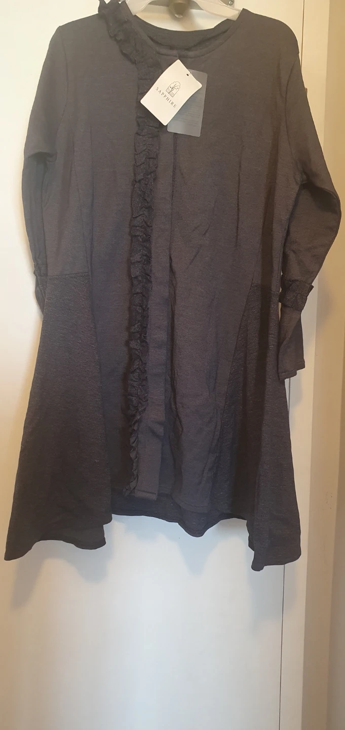 This is a Sapphire women's long-sleeved top in grey. It features ruffled detailing down the front and on the sleeves. The fabric is a soft blend, perfect for layering or casual wear.