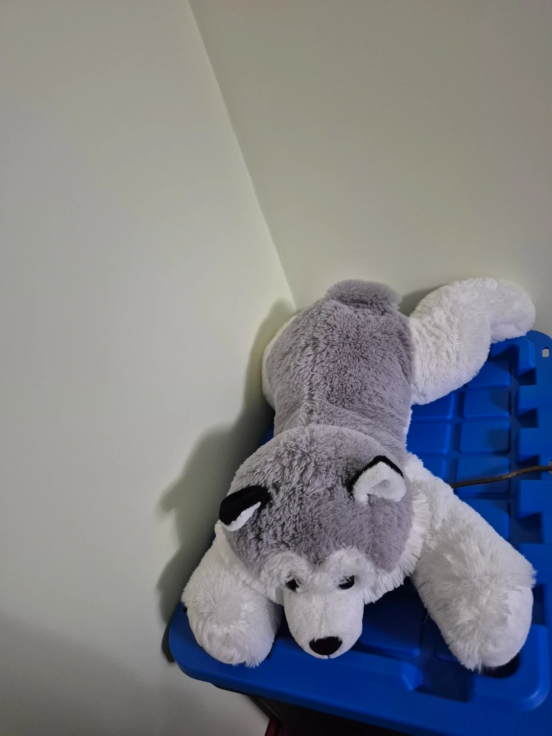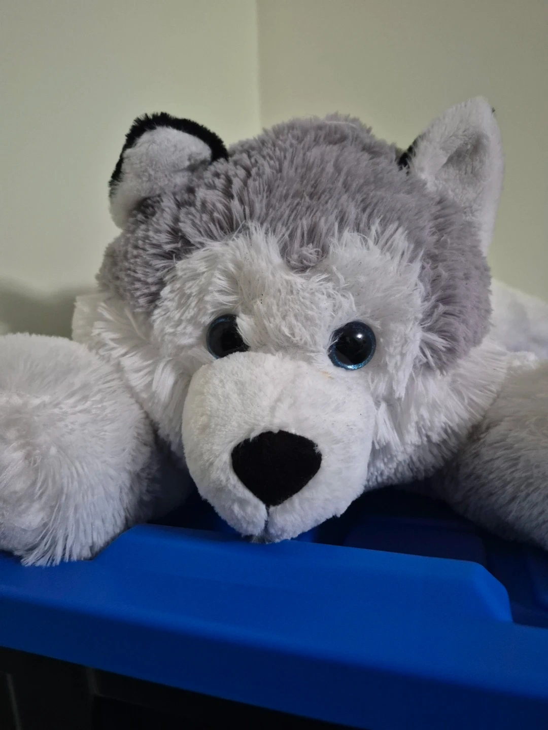 Not used, This is a soft and cuddly plush husky stuffed animal. It's grey and white with blue eyes. It's a good size for hugging!