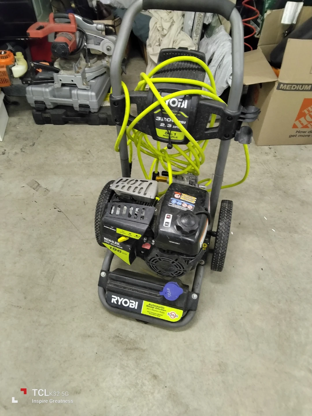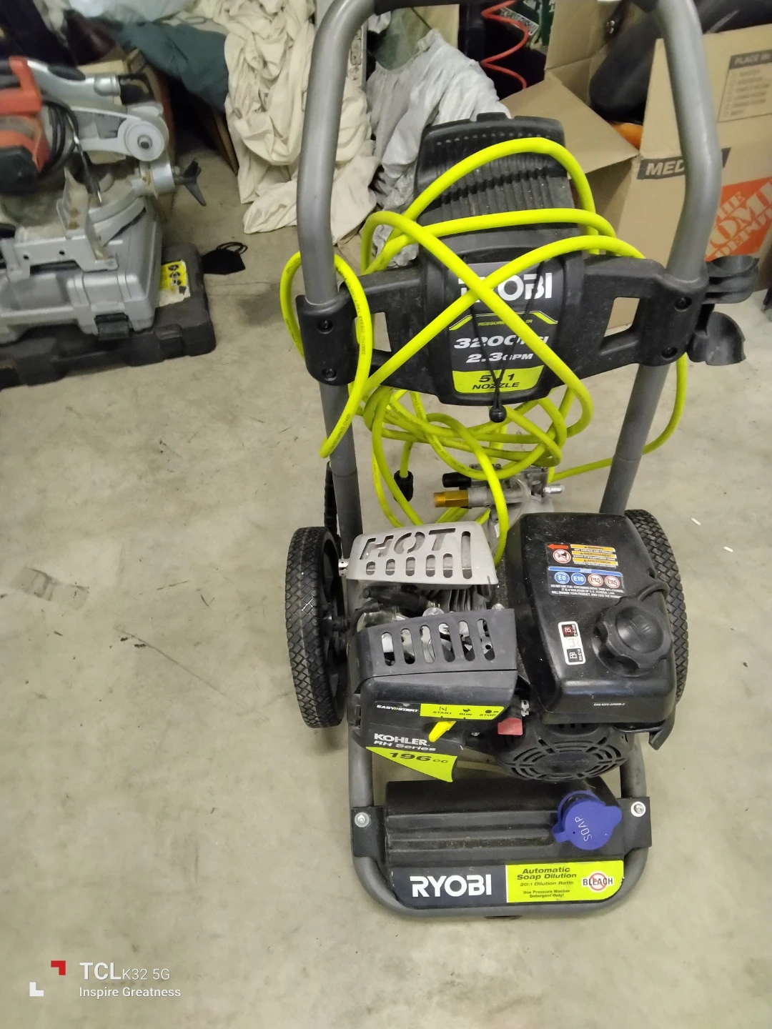 This Ryobi pressure washer boasts 3200 PSI and 2.3 GPM for powerful cleaning. It features a Kohler 196cc engine and a 5-in-1 nozzle for versatile use. This unit is great for tackling tough outdoor cleaning jobs!