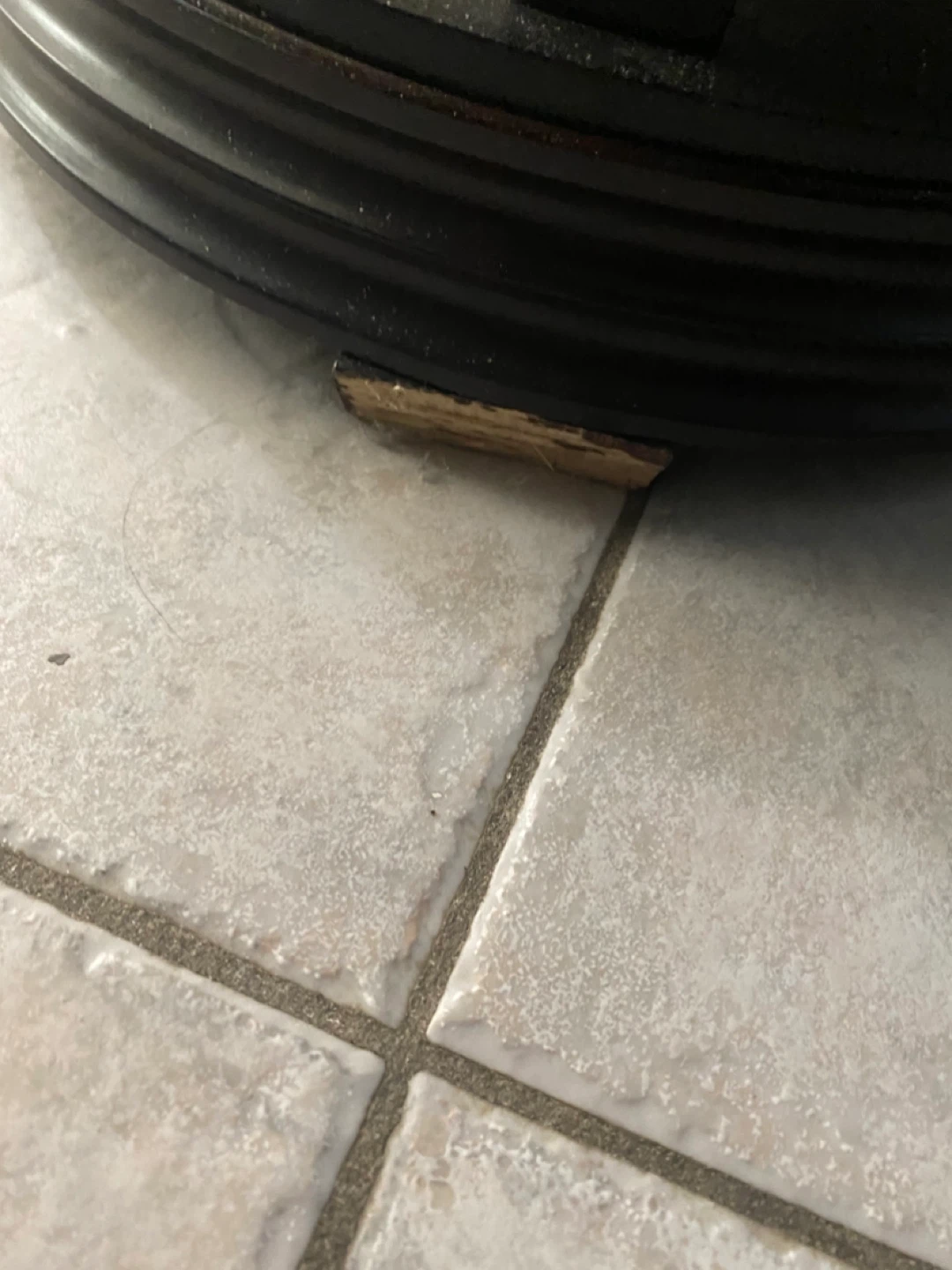 This round accent table is made of dark wood with a decorative carved detail on the apron. It has a lower shelf for additional storage or display. Minor damage to one of the base supports is visible. Has some minor scratches.