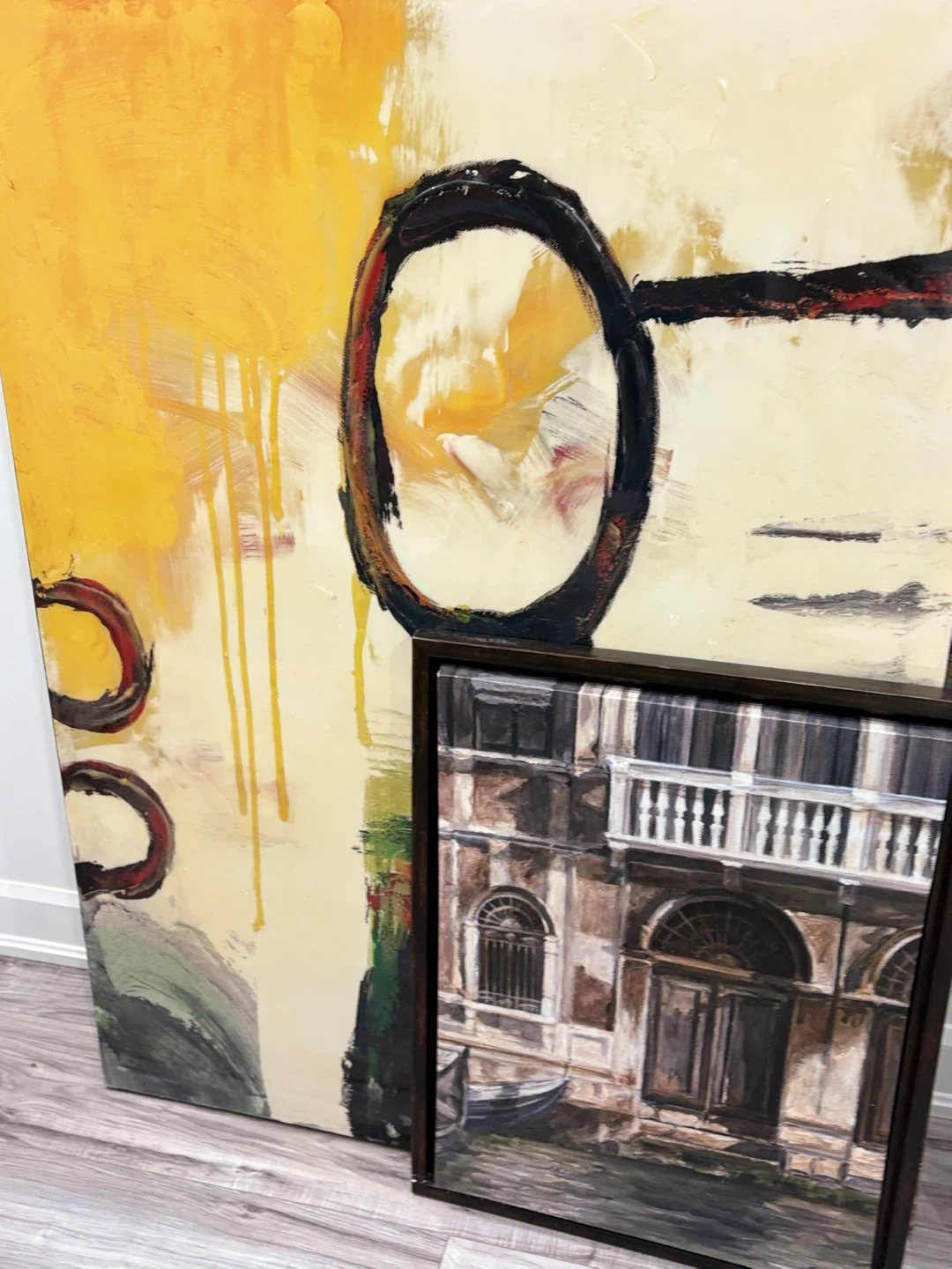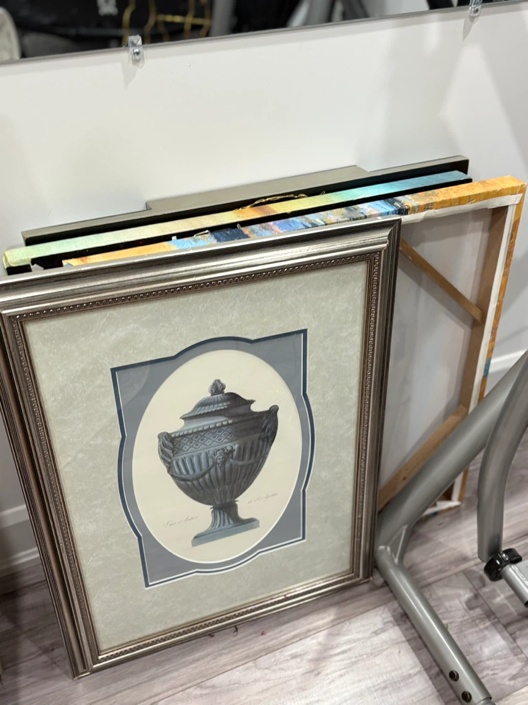 A collection of various home decor items including wall art, a mirrored cabinet, and decorative shelves. These items are in good condition and ready to add a touch of style to your home. Perfect for anyone looking to refresh their living space with unique pieces