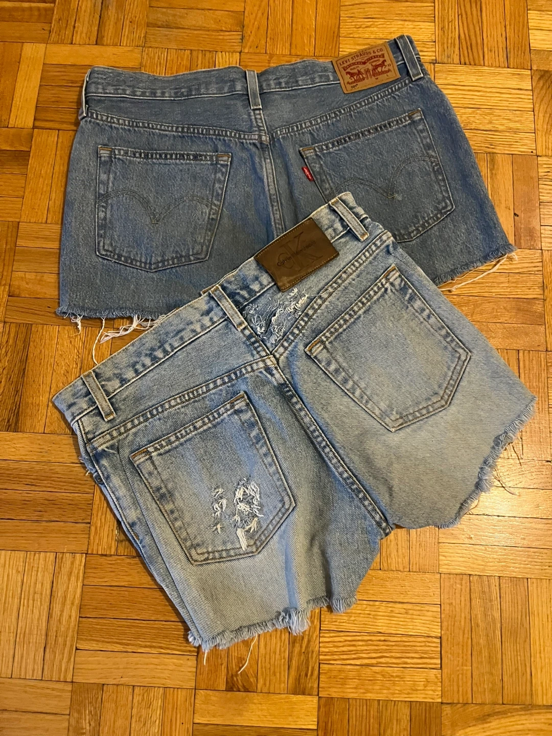 Two pairs of distressed denim shorts. Includes Levi's 501 shorts and Calvin Klein jeans shorts. Both feature raw hems and a light wash.