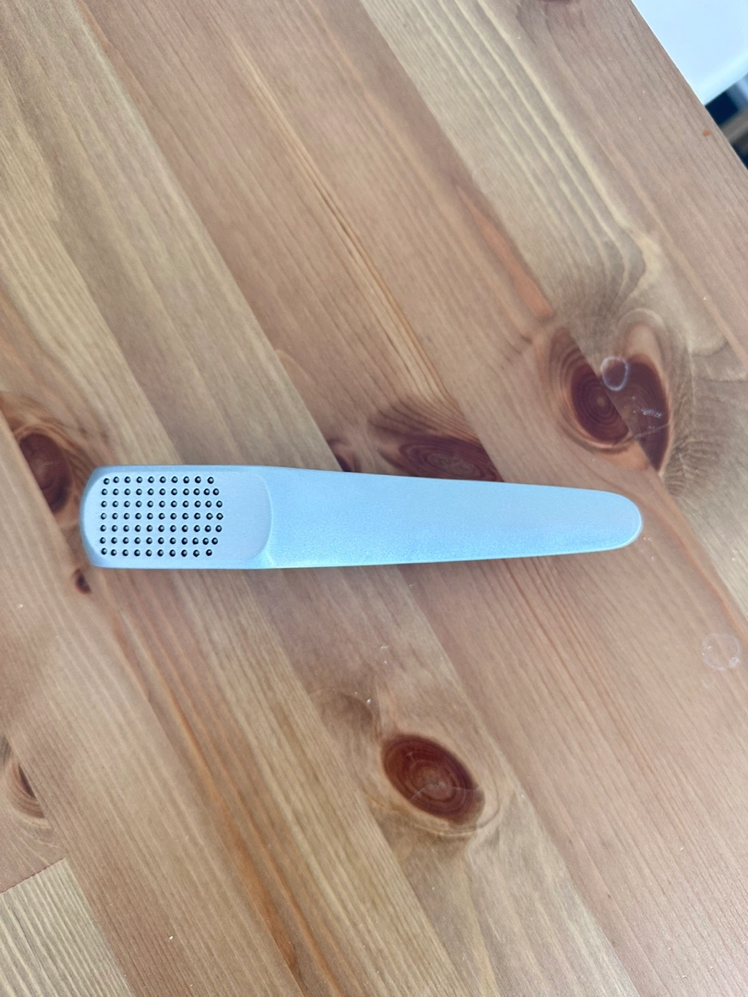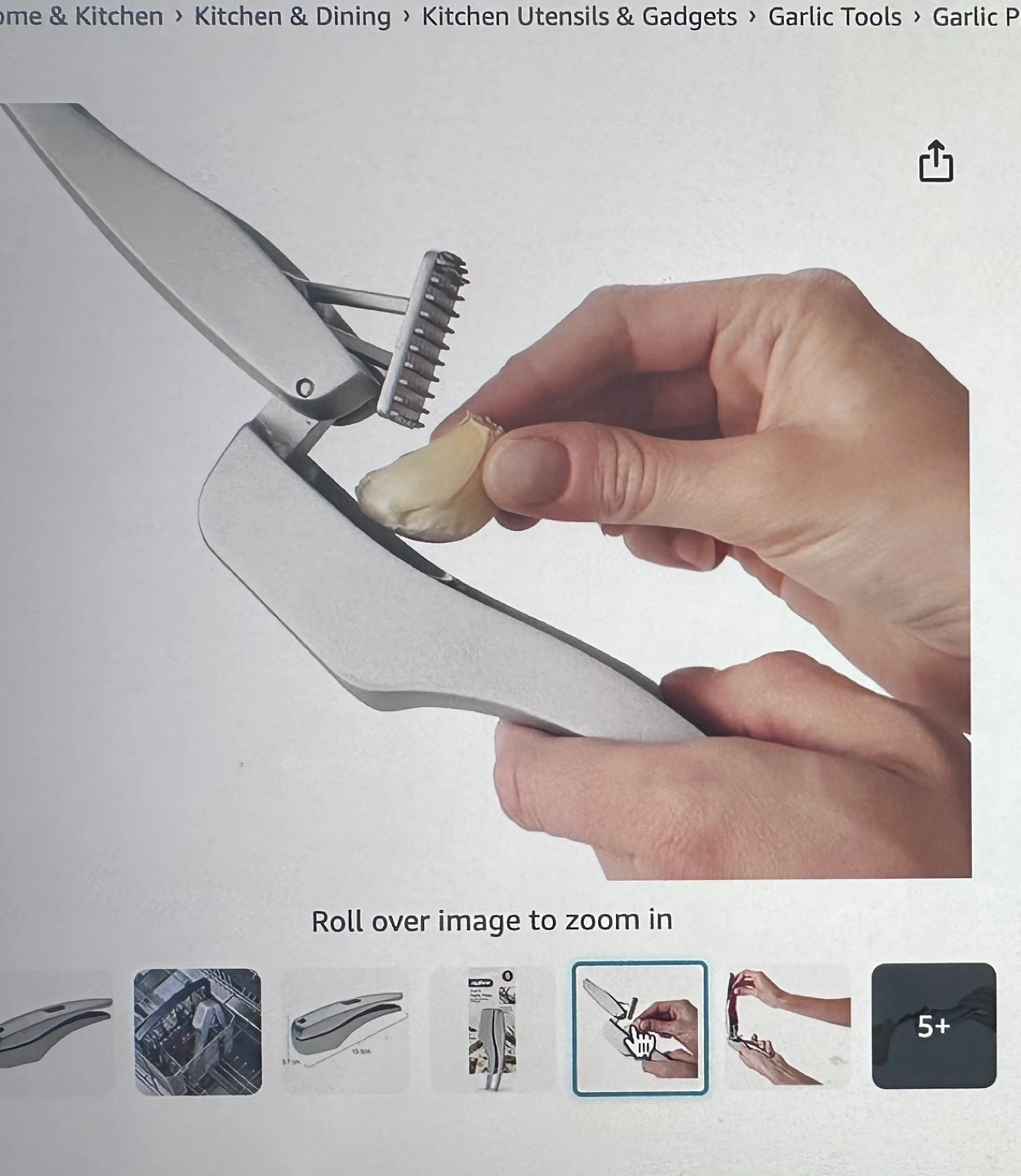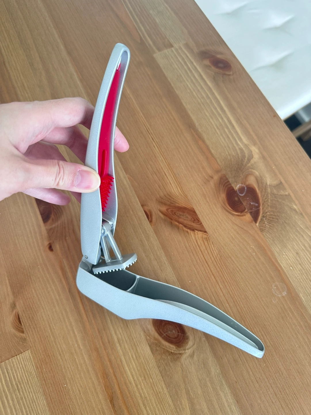 529* Press several garlic cloves at once with this oversized press * Its powerful, specially designed plunger removes the peelings and quickly extracts garlic bits and juice * No need to peel your garlic before you press it—this tool can press cloves with the skin on or off * The handle is ergonomically designed for better leverage and easy squeezing, and the nonstick coating is odor resistant