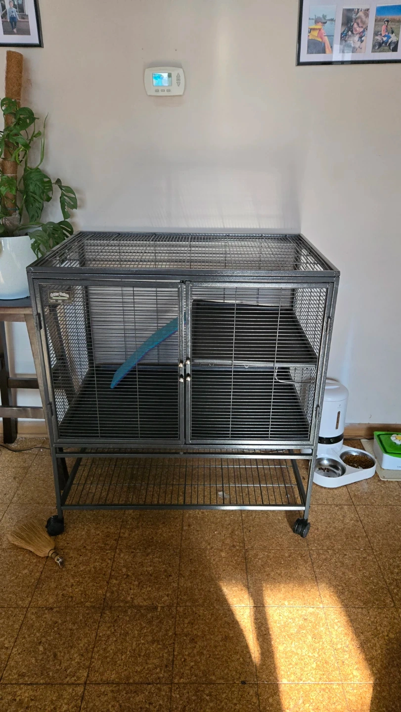 This cage is designed for small animals like ferrets. It includes adjustable shelves and a leak-proof pan. The dimensions are 36 L x 24 W x 39 H inches.