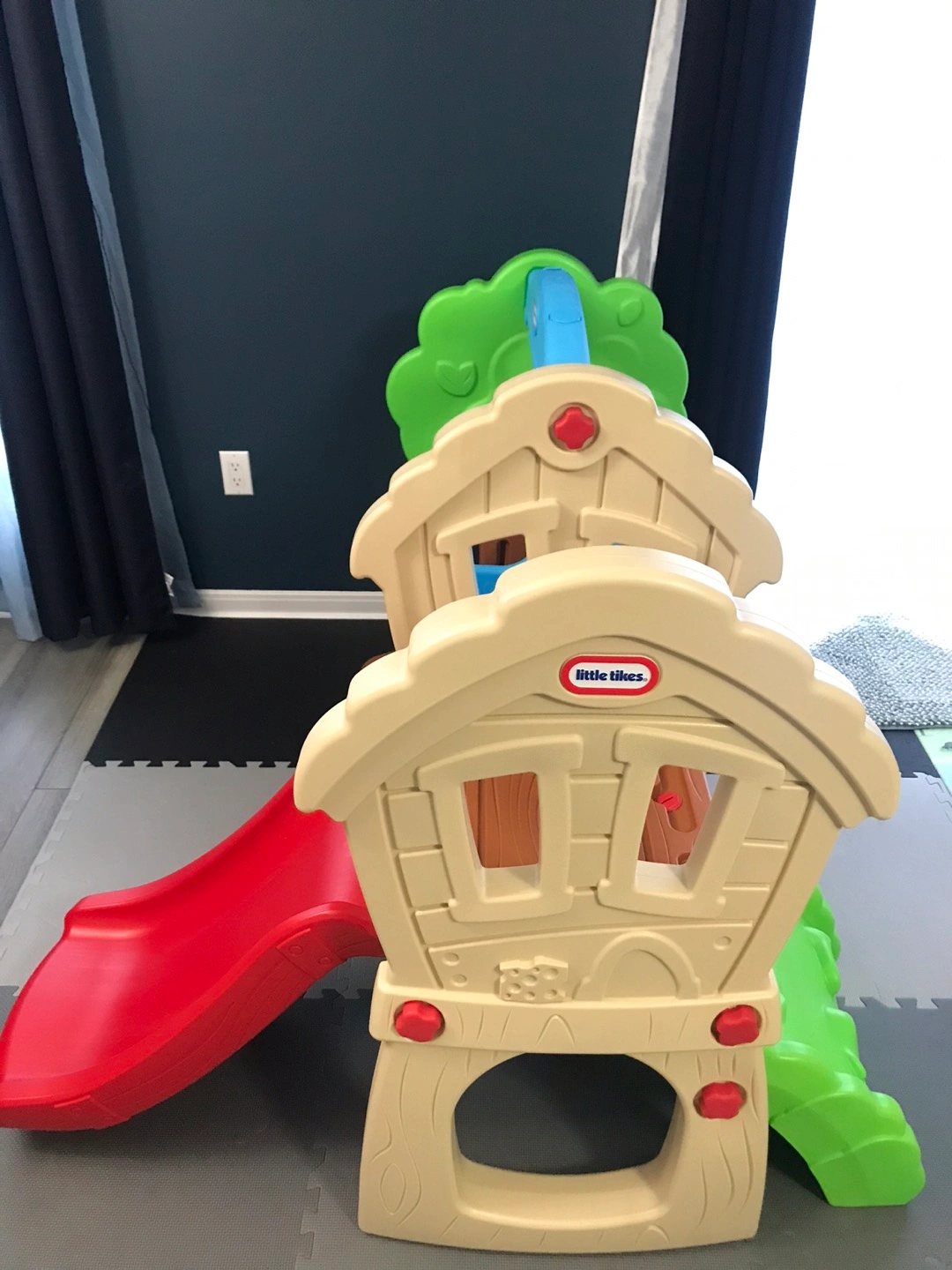 As shown in the pictures, it is sturdy and in good condition. It was used only in a clean room, and the slide is a climbing lock type, not a staircase, so the child likes it.