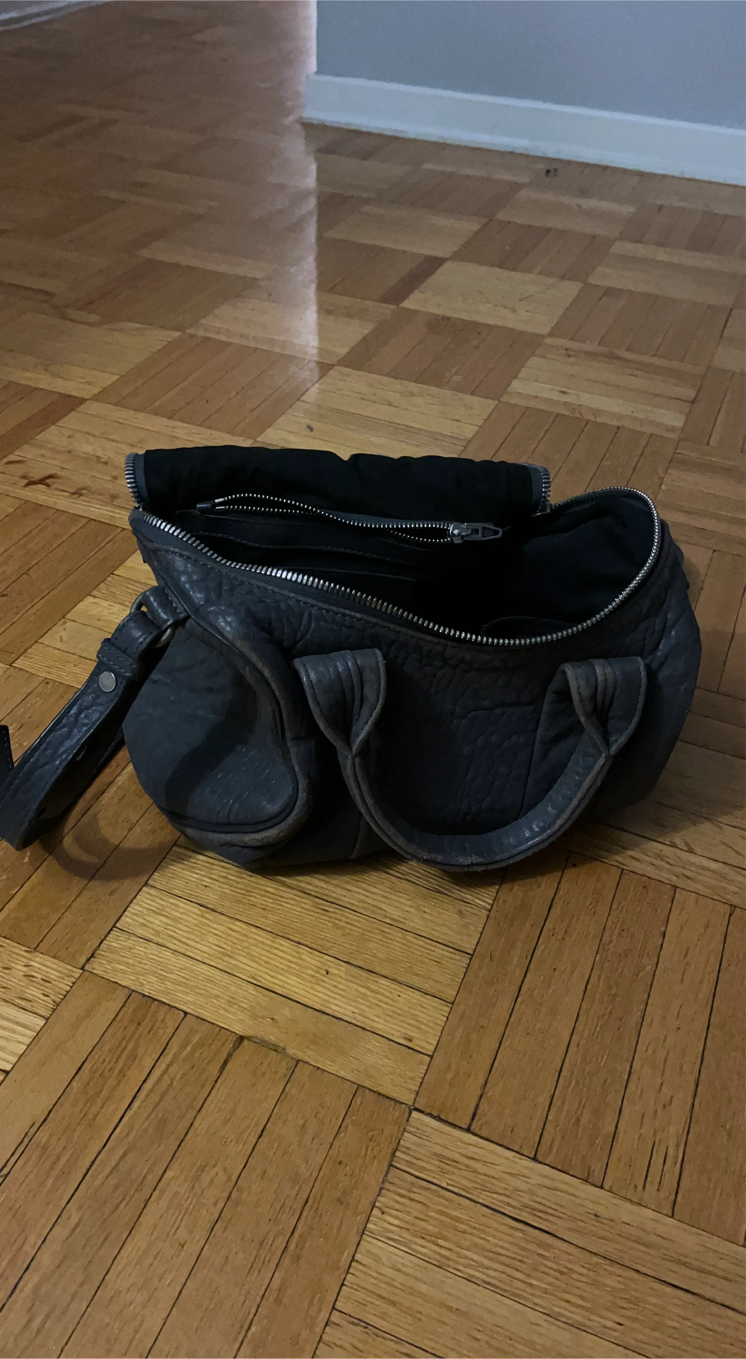 Selling a gently used Alexander Wang Rocco duffel bag in grey. It's a stylish and durable bag that's perfect for everyday use. It has some signs of wear, but it's still in great condition and has lots of life left!