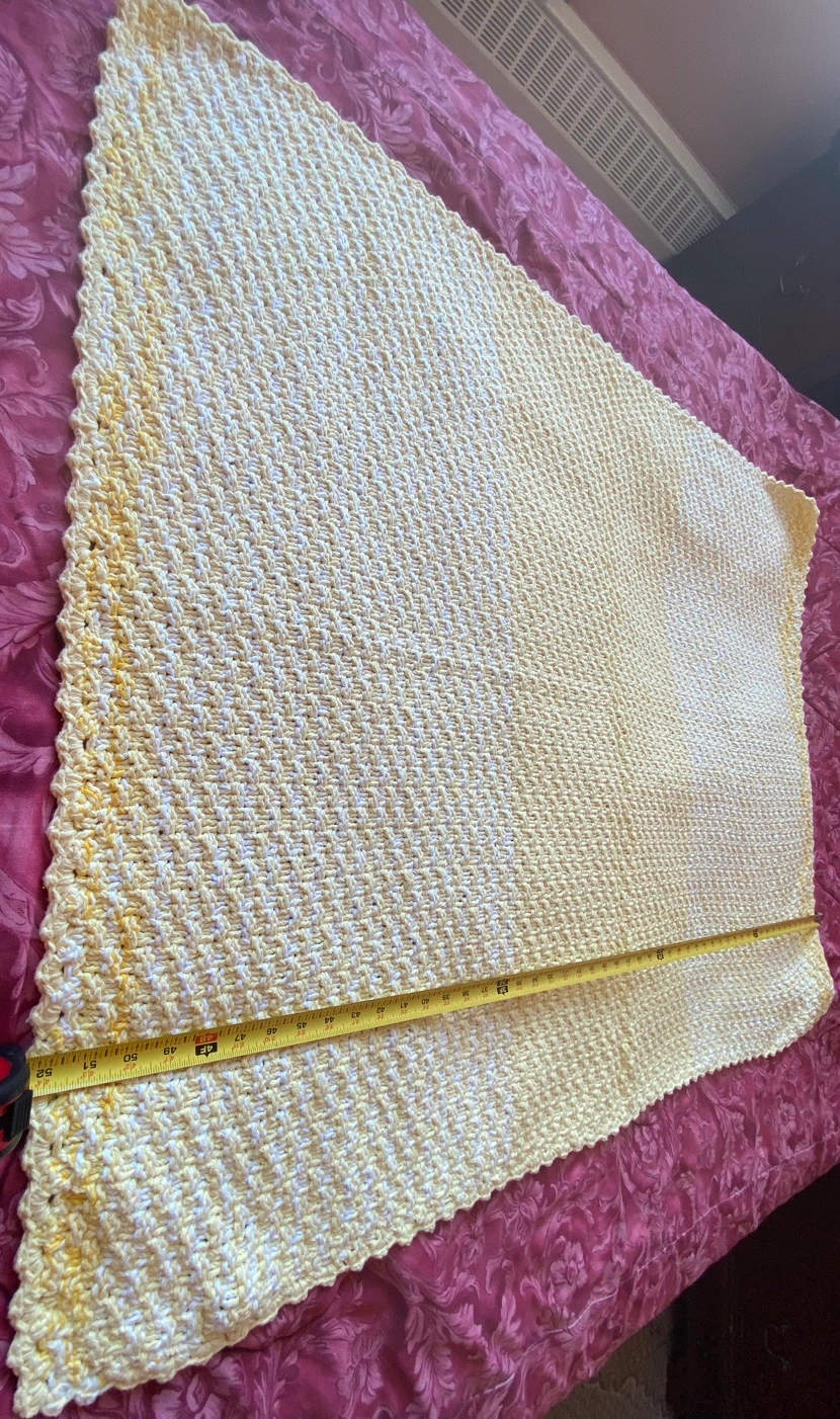 Yellow and white crocheted baby blanket with a scalloped edge. Measures 40.5 inches wide by 52.5 inches long. Can be used also as a throw/covering for the couch.