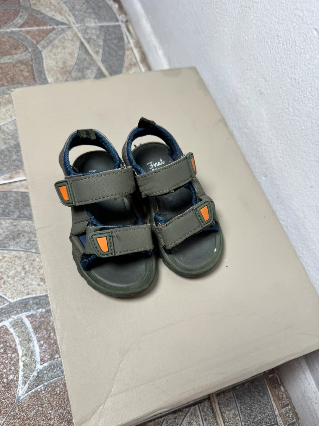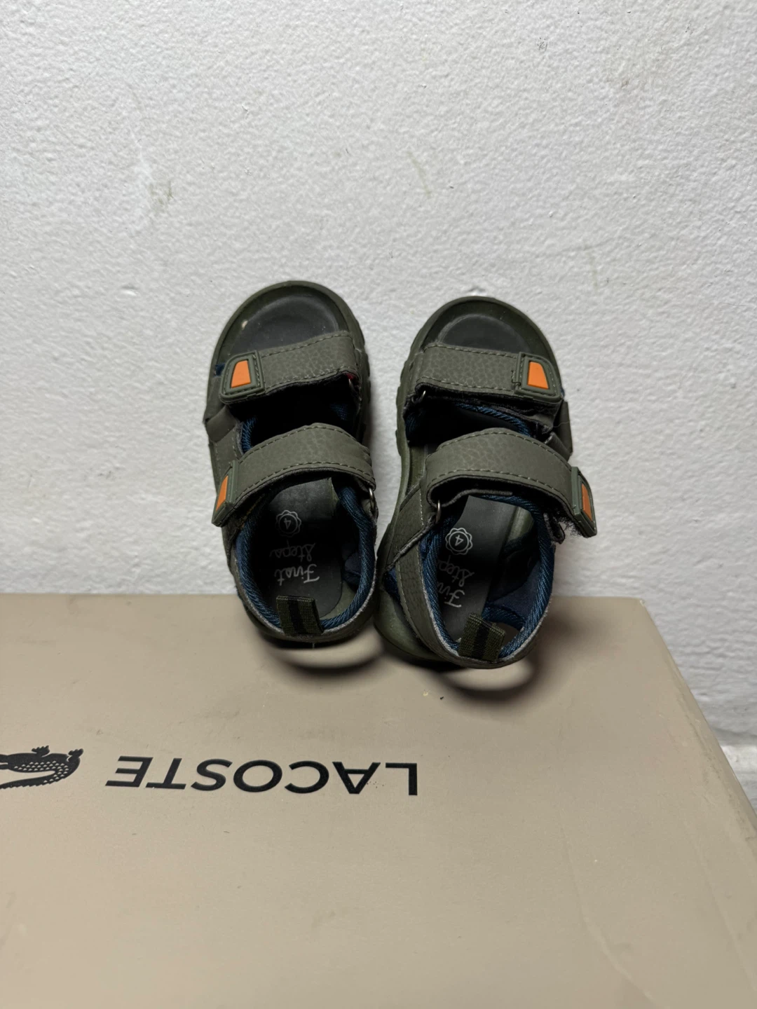 Green First Steps sandals for little ones. These feature adjustable hook-and-loop straps for a secure fit. Size is 4.