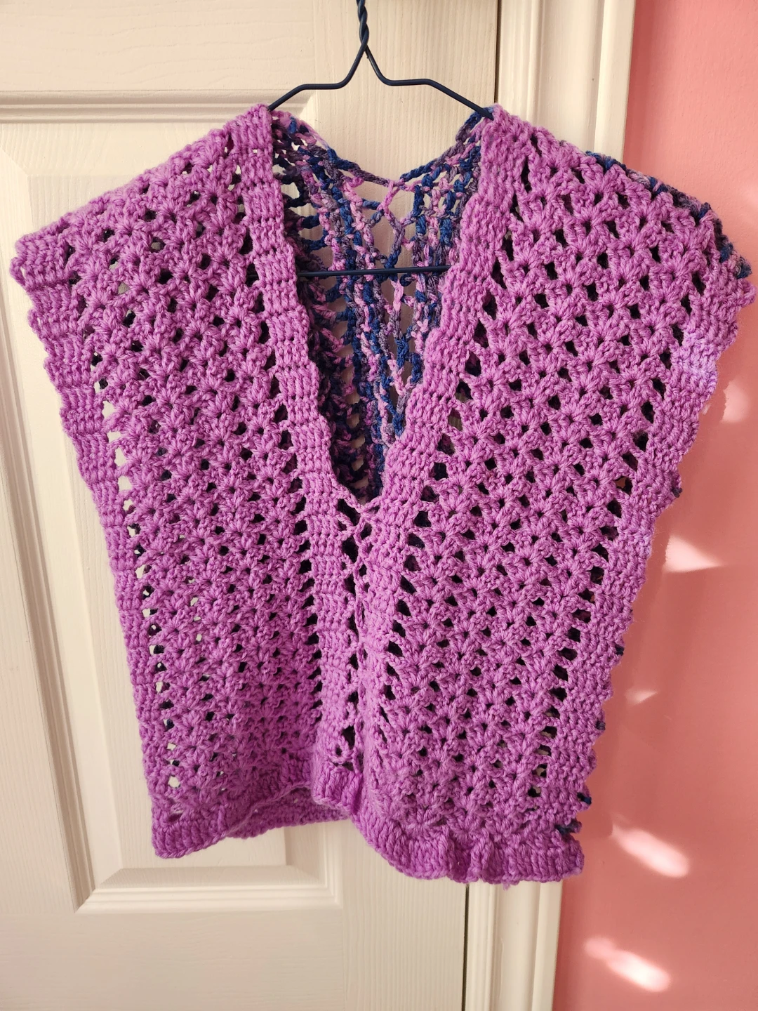 A lovely handmade crochet top in a beautiful lavender colour. It features a contrasting blue open-knit detail at the back and neckline. This sleeveless top is perfect for layering over other pieces. Material appears to be acrylic yarn.