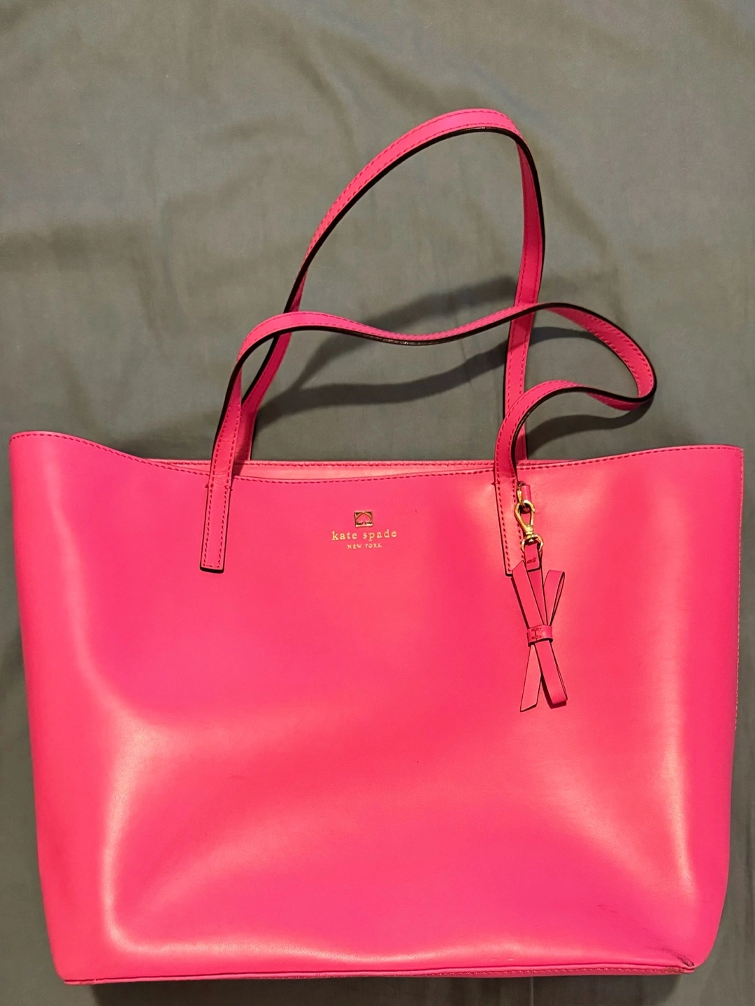 Pink leather large tote bag with gold hardware and a small key charm. The bag is in excellent condition. The interior is red.