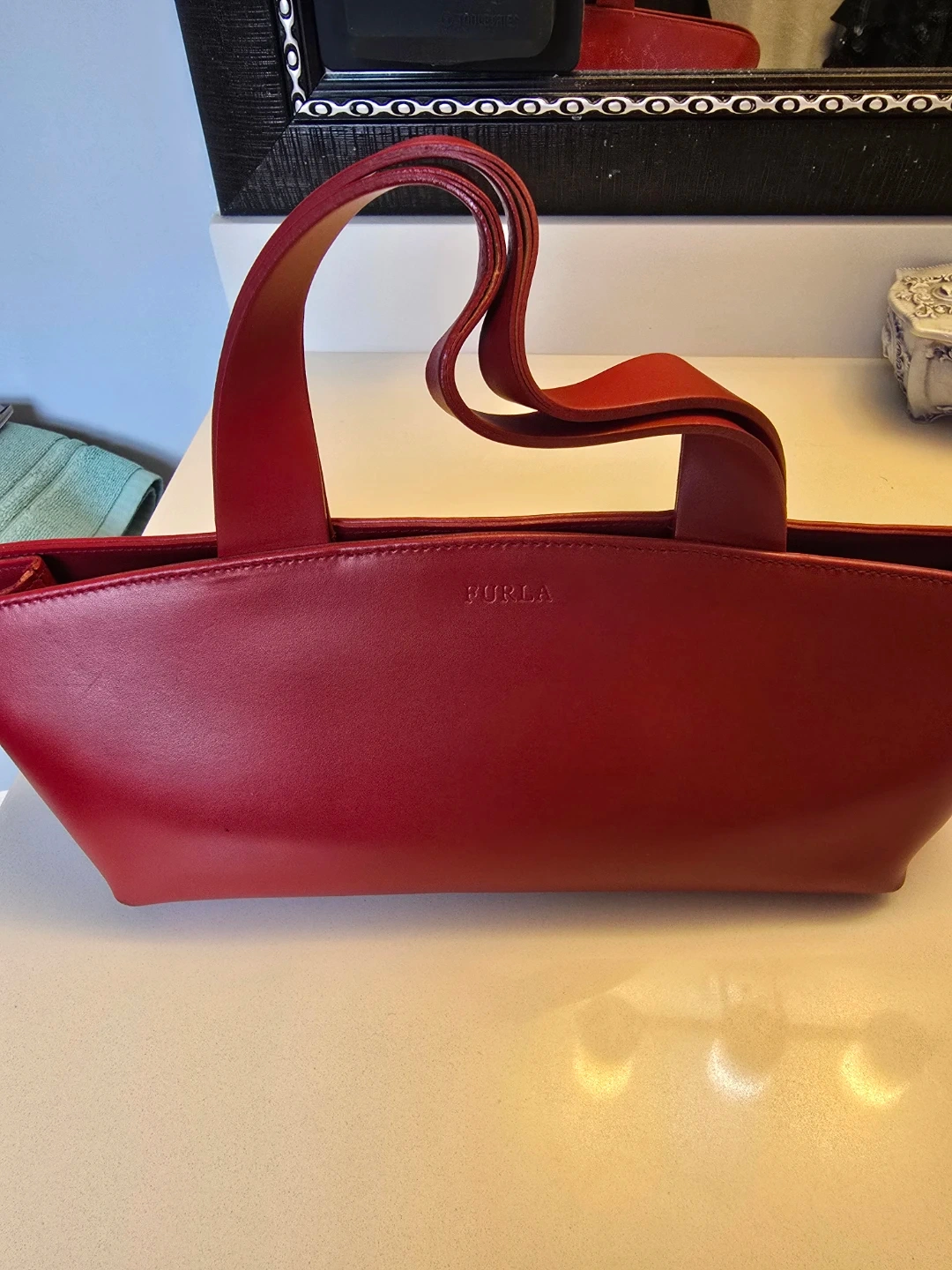A classic red leather tote bag from Furla. It features a spacious interior with zippered and slip pockets. This bag is made from smooth leather.