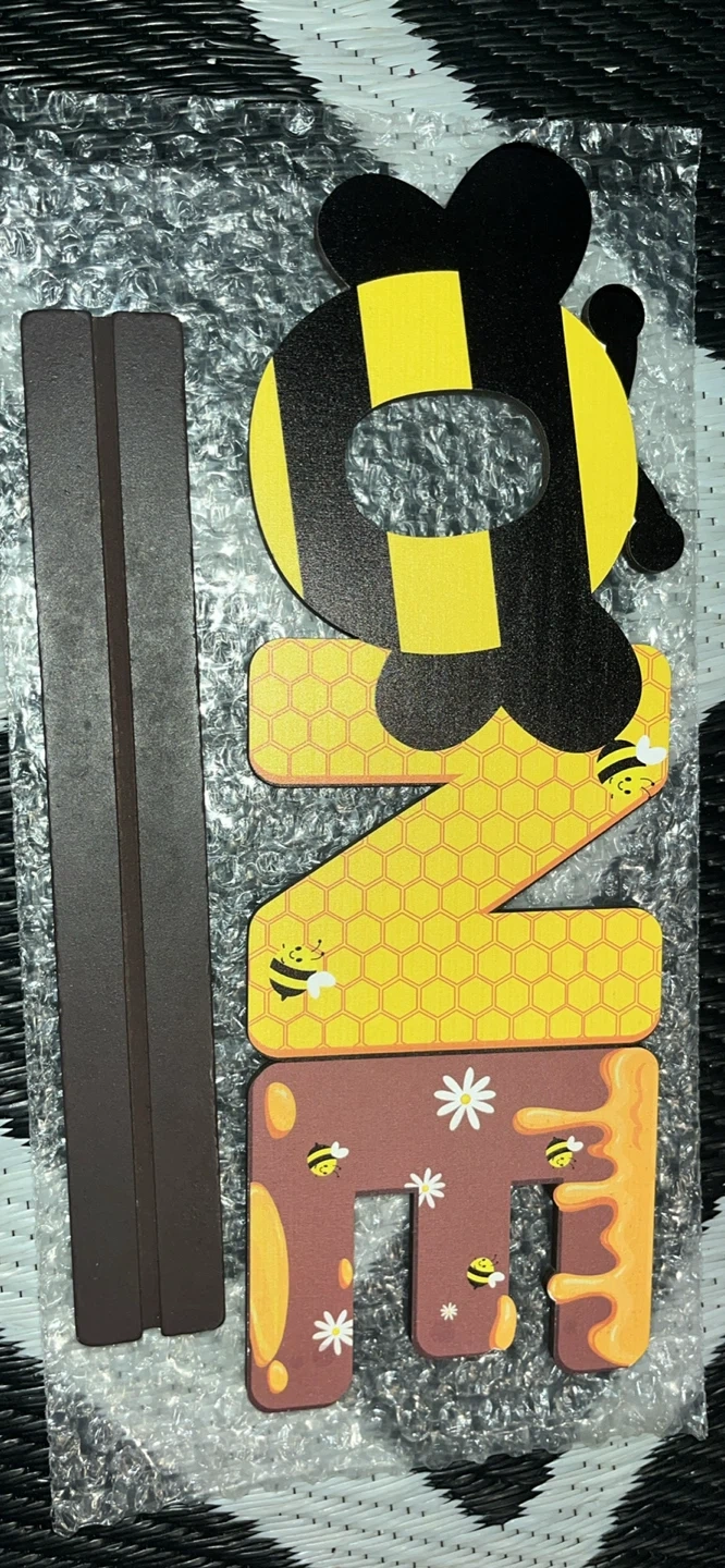 This 'ONE' sign features a bee theme, complete with cute bees, a honeycomb pattern, and honey drips. It is accompanied by a stand, making it suitable for use as a decoration for a first birthday party or a nursery. Pick up naer pape and Danforth please and thank you.