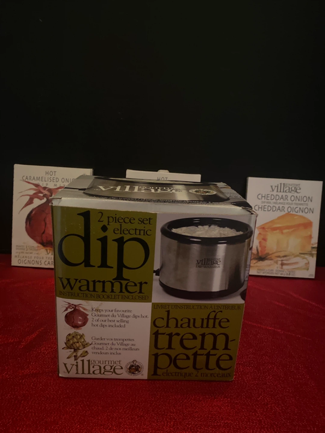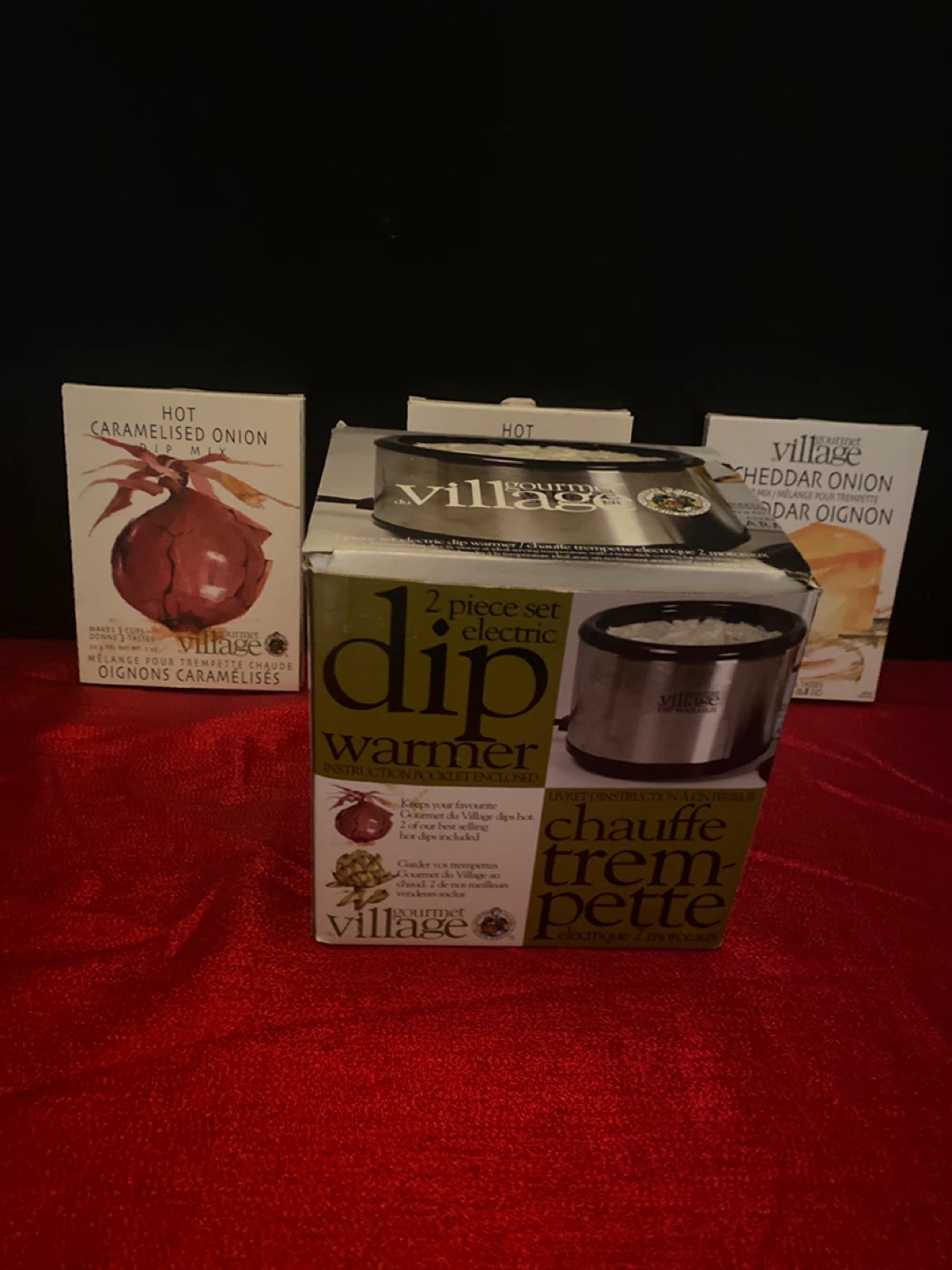 Selling a brand new Village Gourmet dip warmer set! It's a 2-piece electric set, and the instruction booklet is included. Comes with two hot dip mixes: Hot Caramelised Onion and Cheddar Onion. Perfect for entertaining!