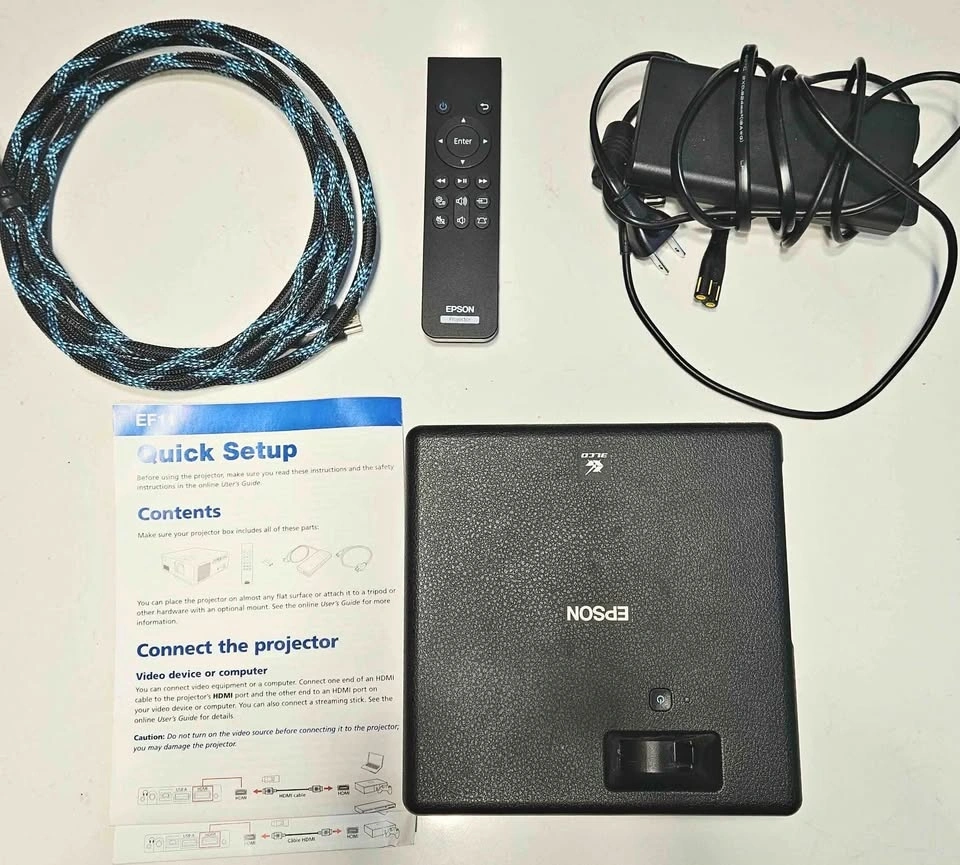 This Epson EpiqVision Mini EF-11 has been used for less than 50 total hours and is in 99% like-new condition. It's incredibly portable and powerful, weighing only 2.7 lbs, perfect for moving room-to-room or travel. It delivers a bright picture with 1000 ANSI lumens and Full HD resolution (1080p). Features long-lasting, maintenance-free laser technology. Includes the projector, remote control, power cable, and manual.