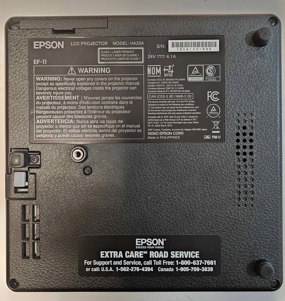 This Epson EpiqVision Mini EF-11 has been used for less than 50 total hours and is in 99% like-new condition. It's incredibly portable and powerful, weighing only 2.7 lbs, perfect for moving room-to-room or travel. It delivers a bright picture with 1000 ANSI lumens and Full HD resolution (1080p). Features long-lasting, maintenance-free laser technology. Includes the projector, remote control, power cable, and manual.