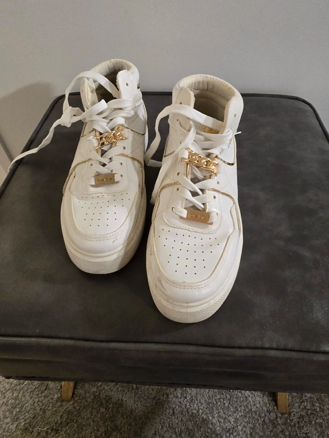 Selling a pair of Bebe Monah high-top sneakers in white! They are a US size 7.5. The upper and sole are made of synthetic materials. They have a stylish gold chain detail.