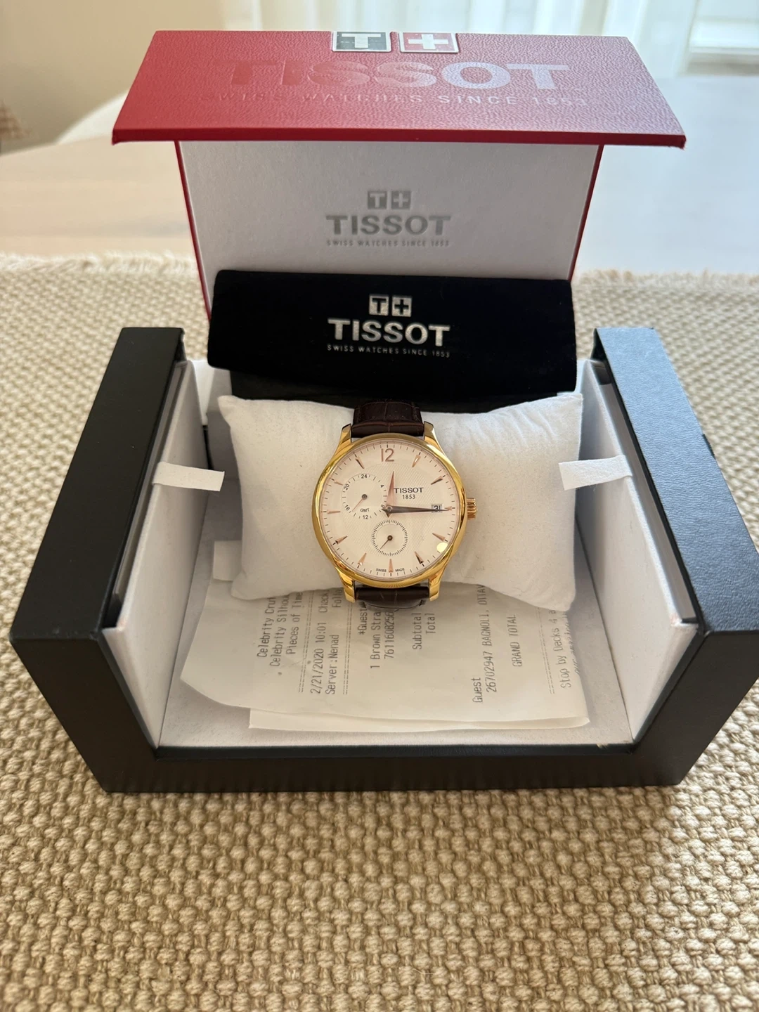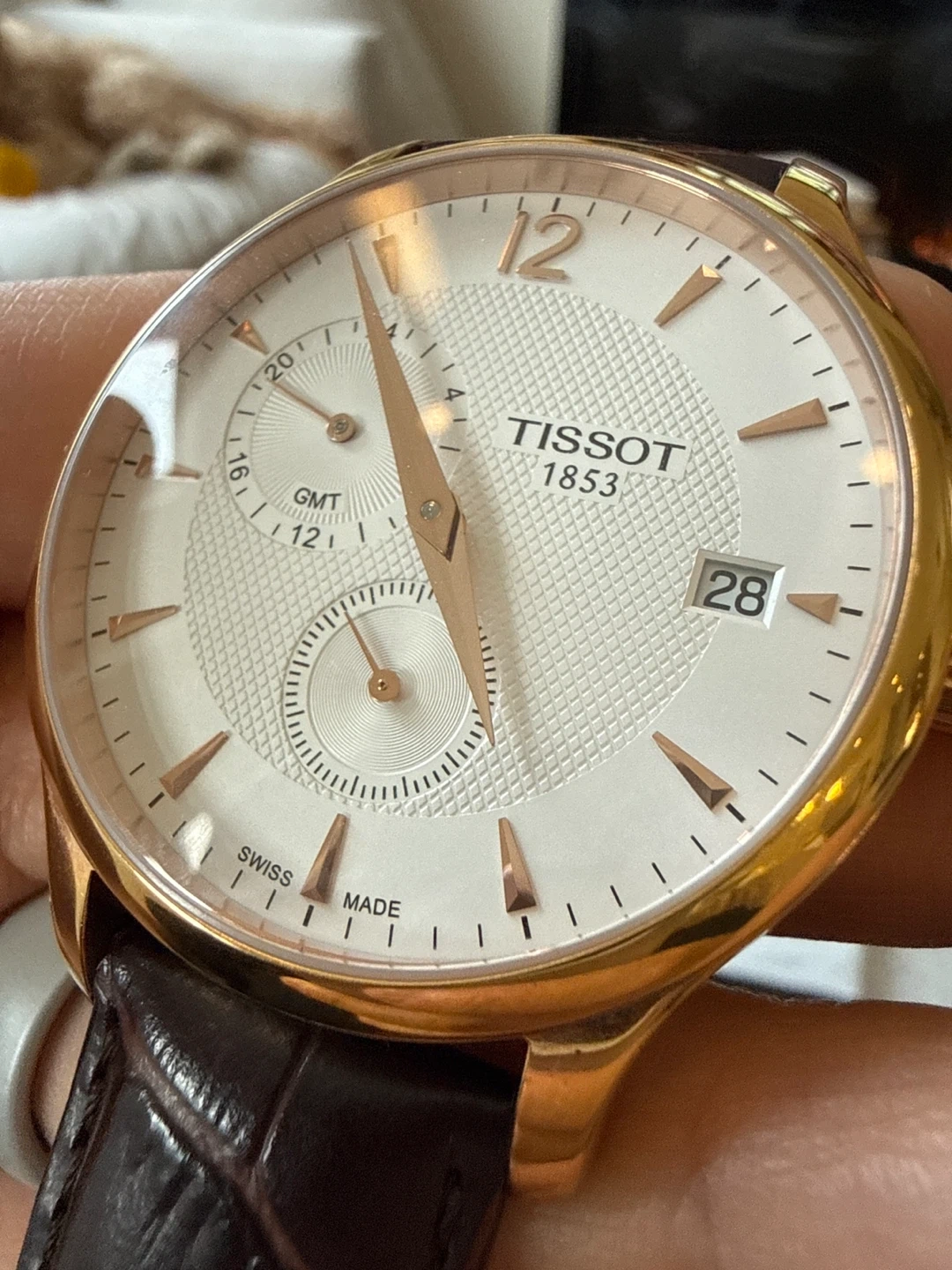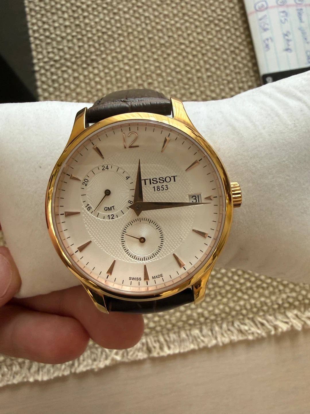 Tissot Tradition GMT quartz watch with a white dial and rose gold PVD stainless steel case. It features a 42mm case diameter, sapphire crystal, and 3 ATM water resistance.