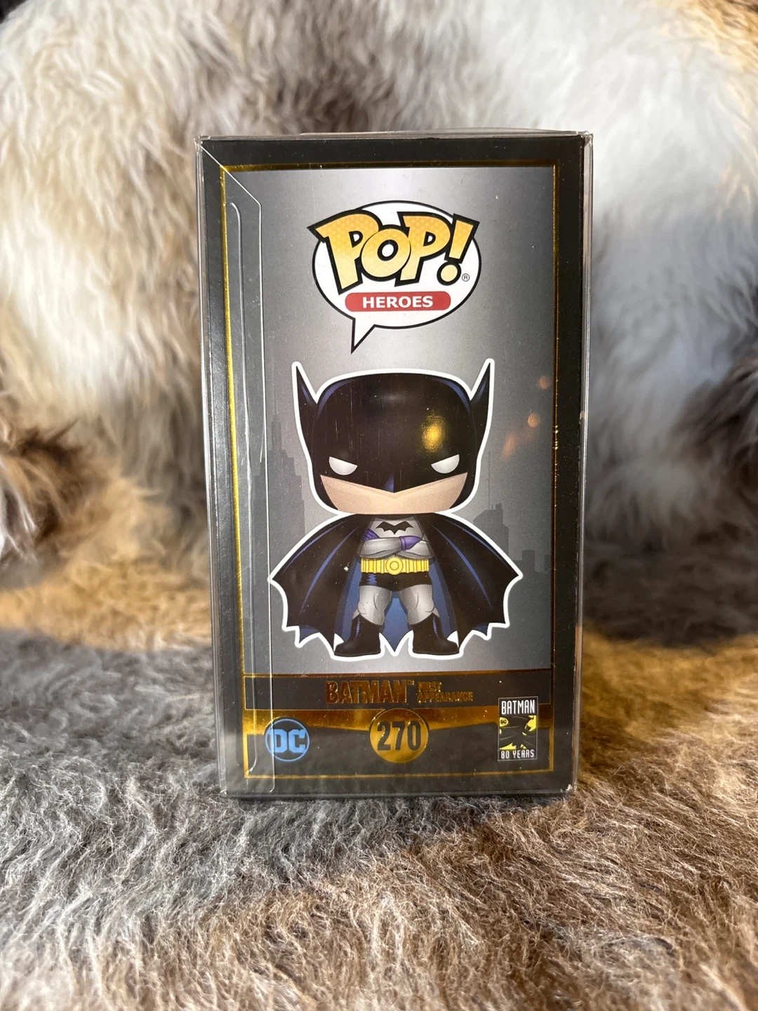 This is the Funko Pop! Heroes Batman celebrating 80 Years, number 270. It's a collectible item for fans. In its original box with a protective sleeve.