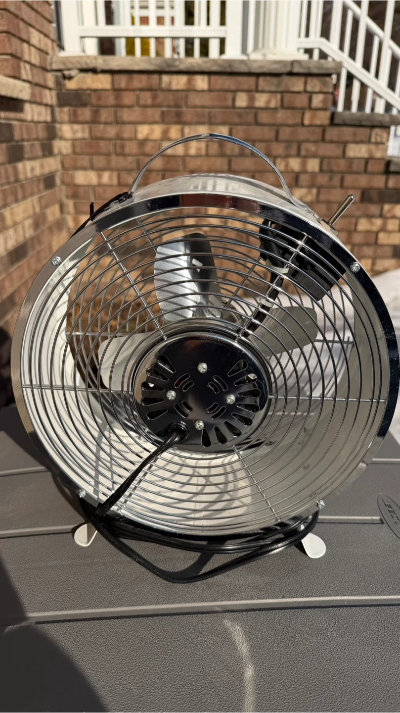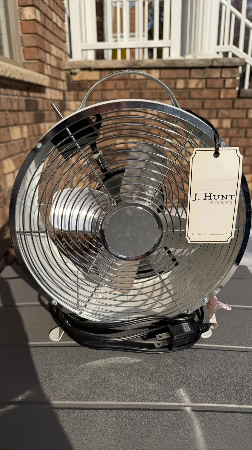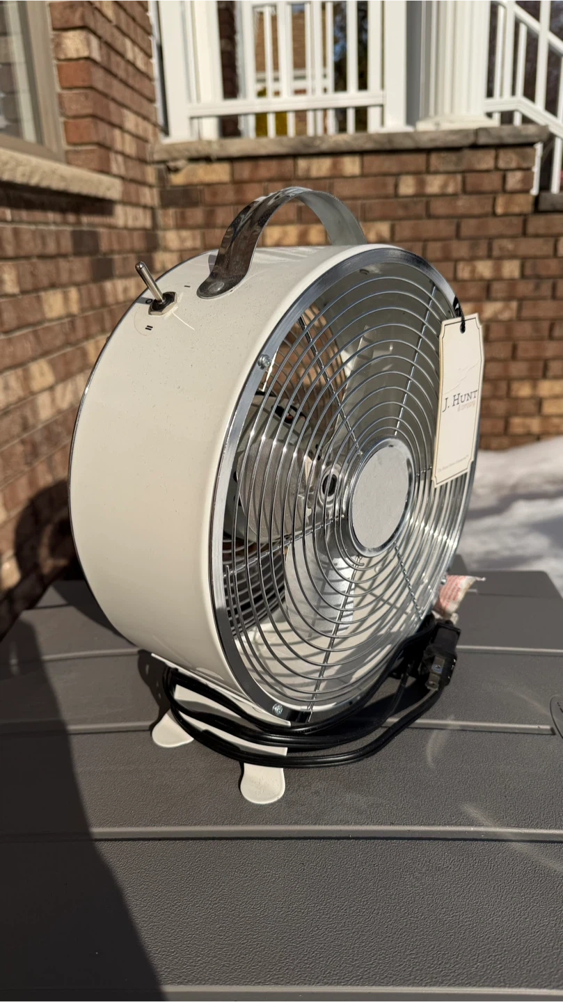 This J. Hunt & Company retro fan has a durable metal construction and a chrome finish. It's a personal-sized fan with a sturdy handle for portability. The fan features a simple on/off switch.