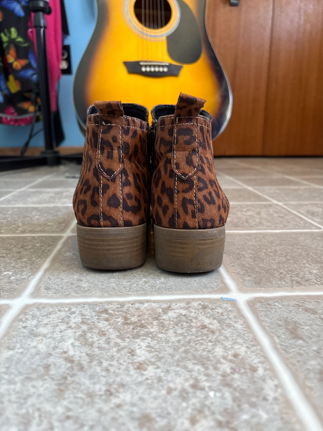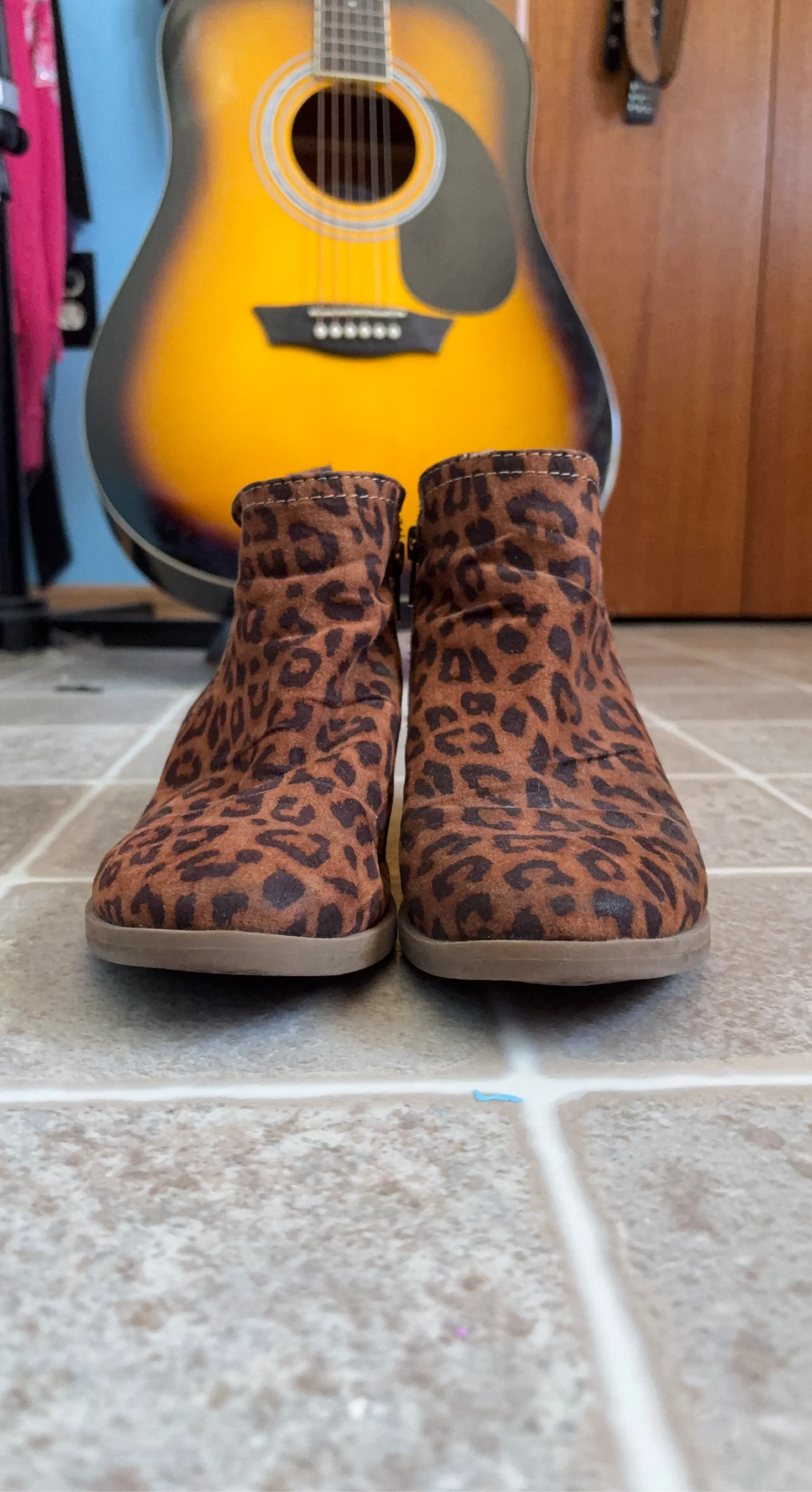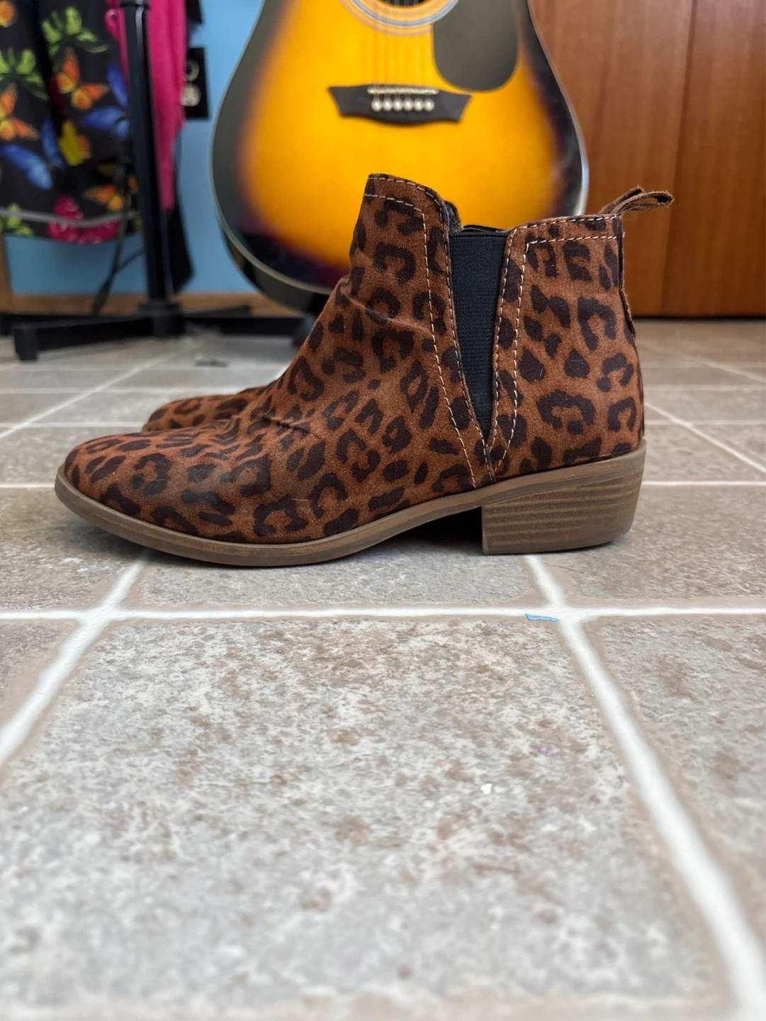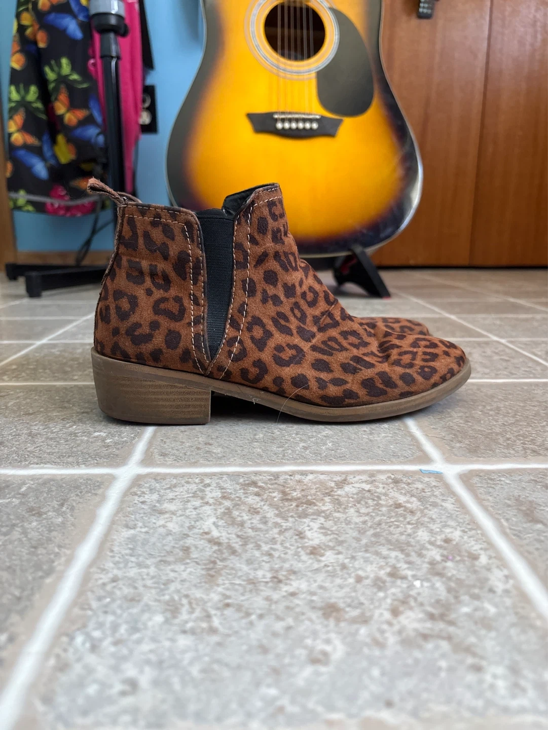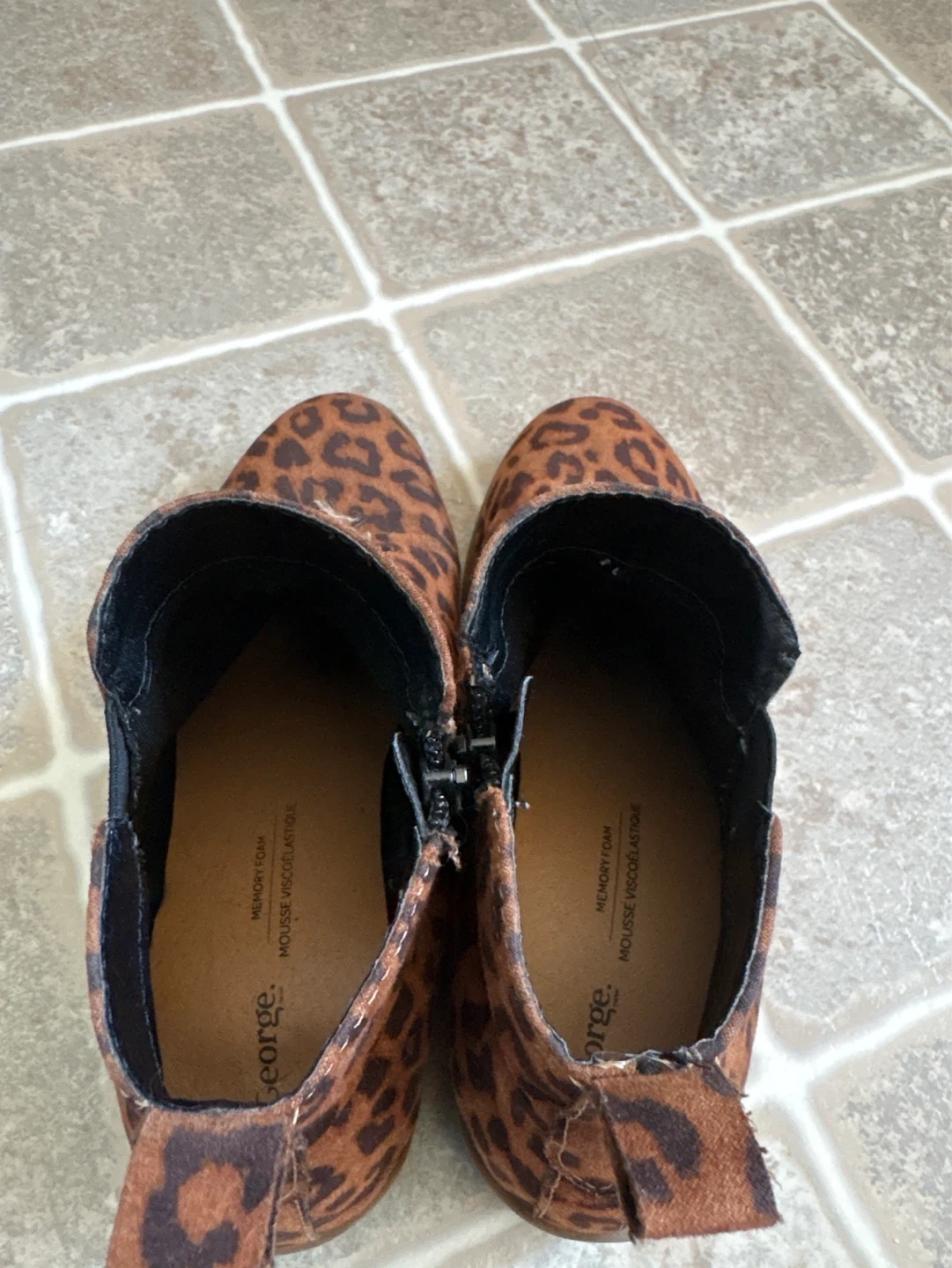 Adorable George ankle boots with a fun leopard print. These boots feature a side zipper and elastic gore for easy wear. They're made with a soft suede-like material and have a cushioned memory foam insole for comfort.