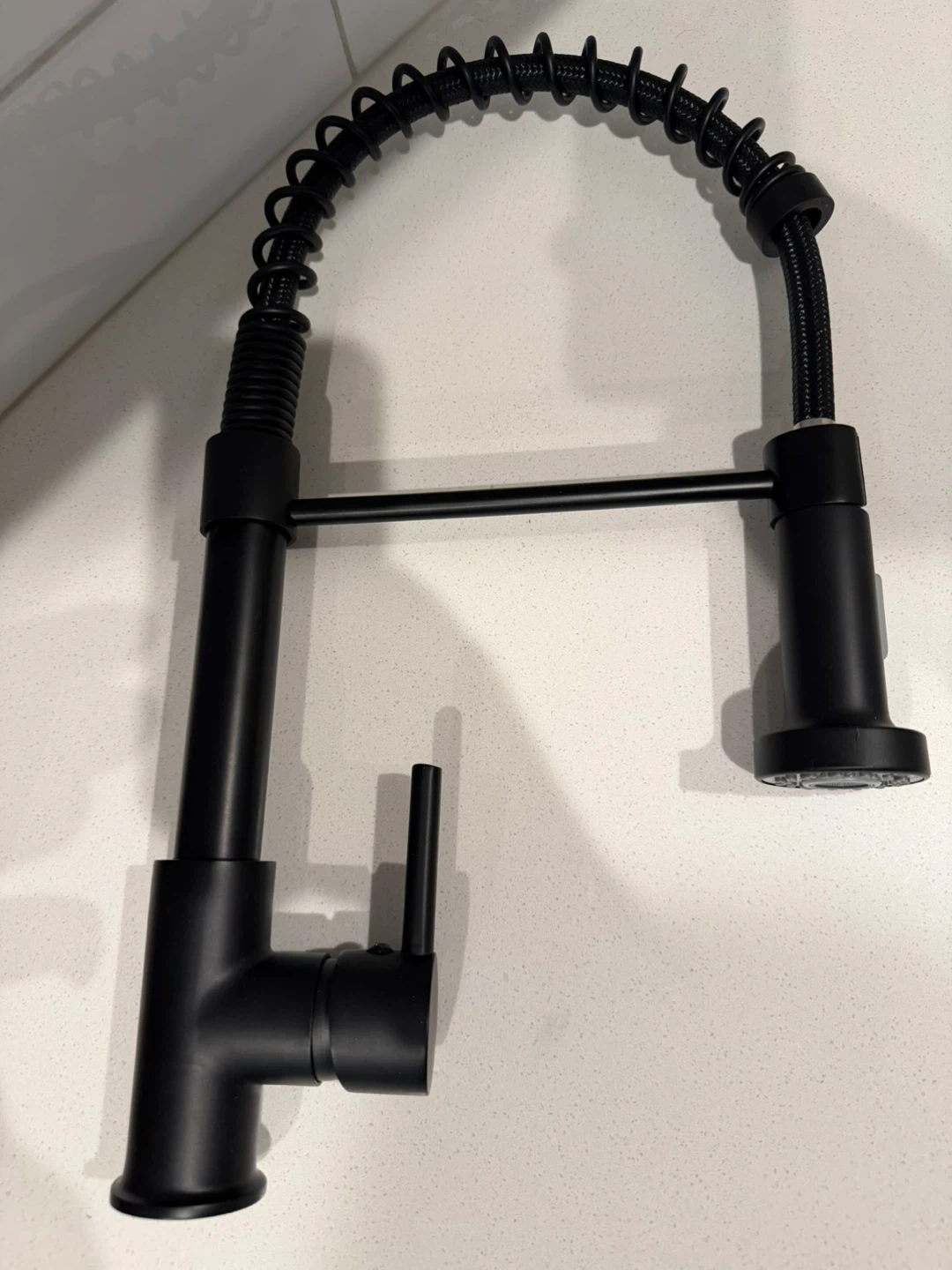Black gooseneck kitchen faucet with a pull-down sprayer. Features a coil hose design. Includes all necessary accessories for installation. Suitable for a modern kitchen setup.