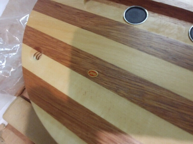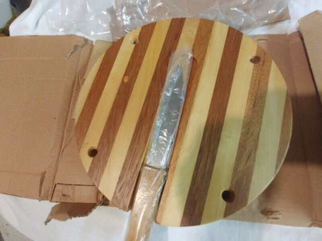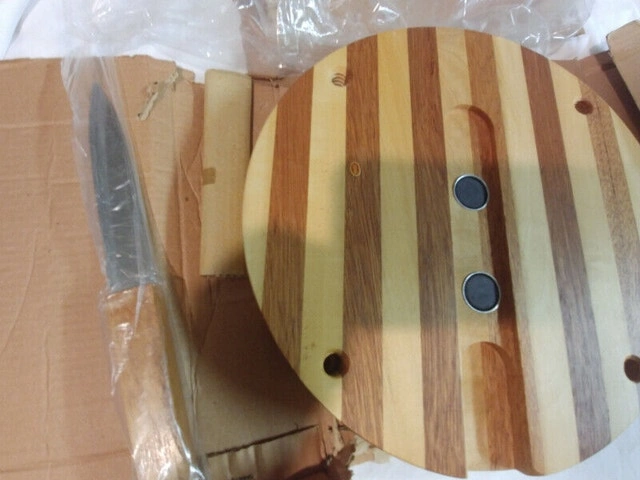 Up for sale, I have two new vintage wood cheese cutting boards made with Japan Wood, made in Japan. The boards are 11 inches by 2 inches and in brand new condition. They come with their original knife. Also included are 4X 2-inch screw-on wooden legs. They have an insert with a magnet under the board to put a knife. I have two for sale: one at $50 with legs and one at $45 without legs. They are one of a kind. For Sale By: Owner