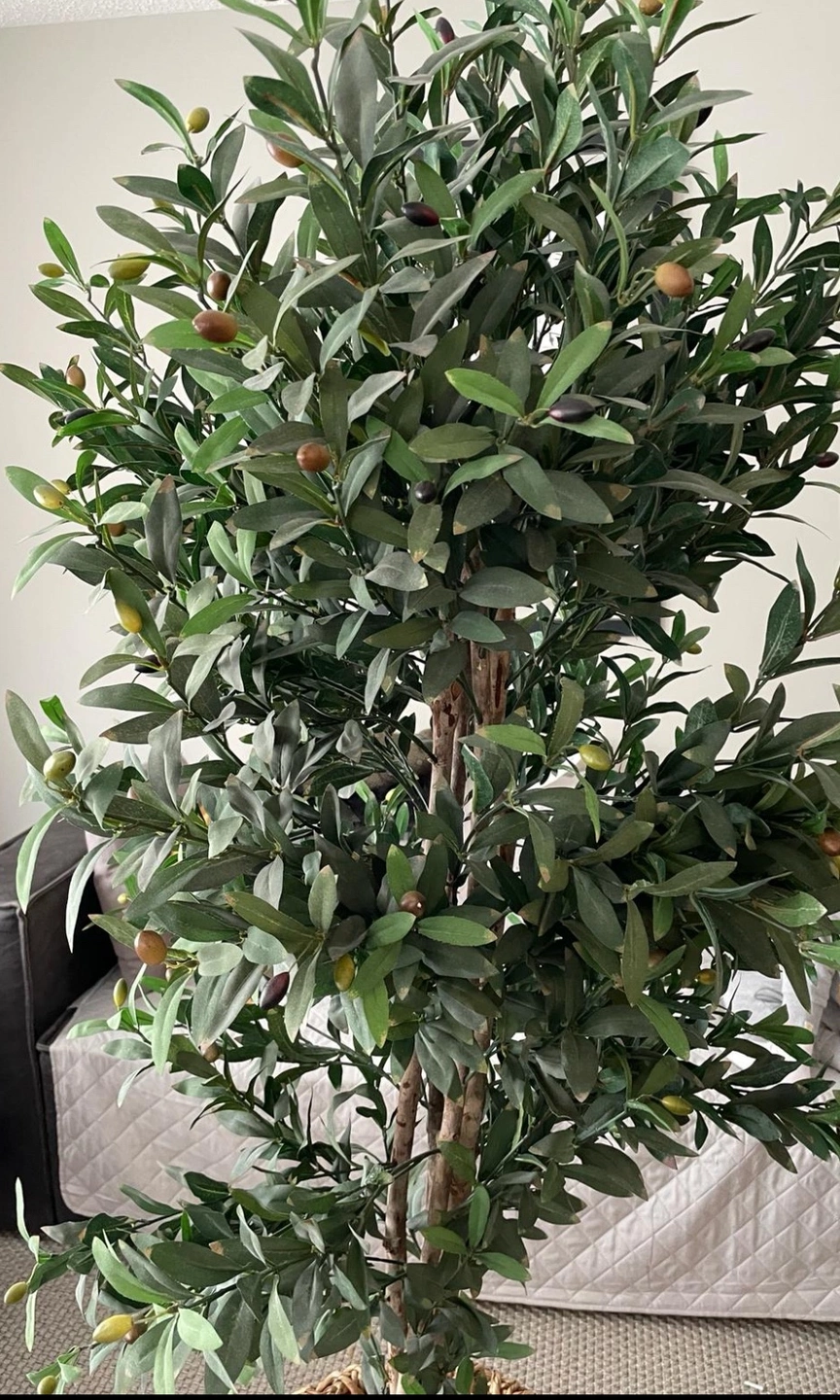 This is an artificial olive tree. It is approximately 4 feet tall. The trunk and branches are made of wood, and the leaves and olives are made of plastic.