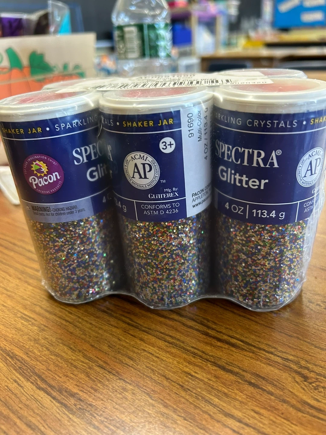 This is a pack of 6 shaker jars of Spectra Glitter in multi-color. Each jar contains 4 oz (113.4 g) of glitter. The glitter conforms to ASTM D 4236. Recommended for ages 3 and up.