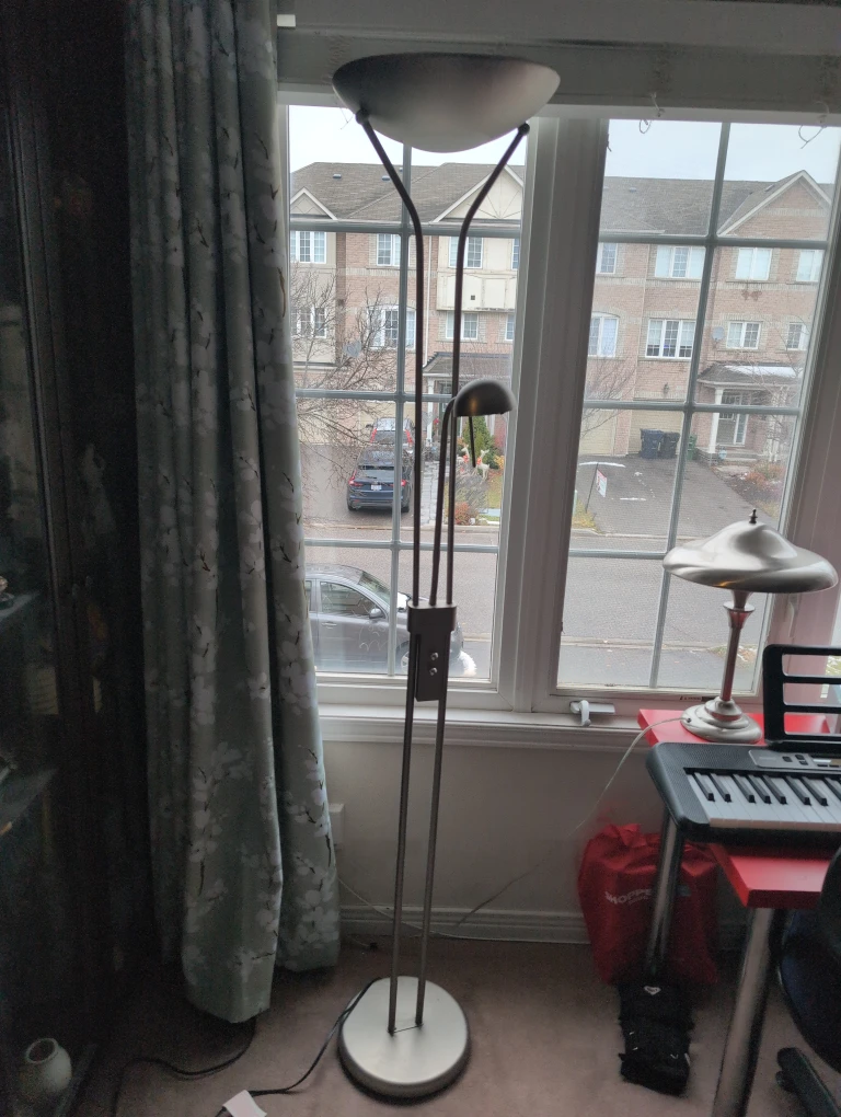 Add some stylish lighting to your space with this torchiere floor lamp! It features a sleek design and provides both ambient and focused light with its adjustable reading lamp. It's in great condition and ready to brighten up any room in your home