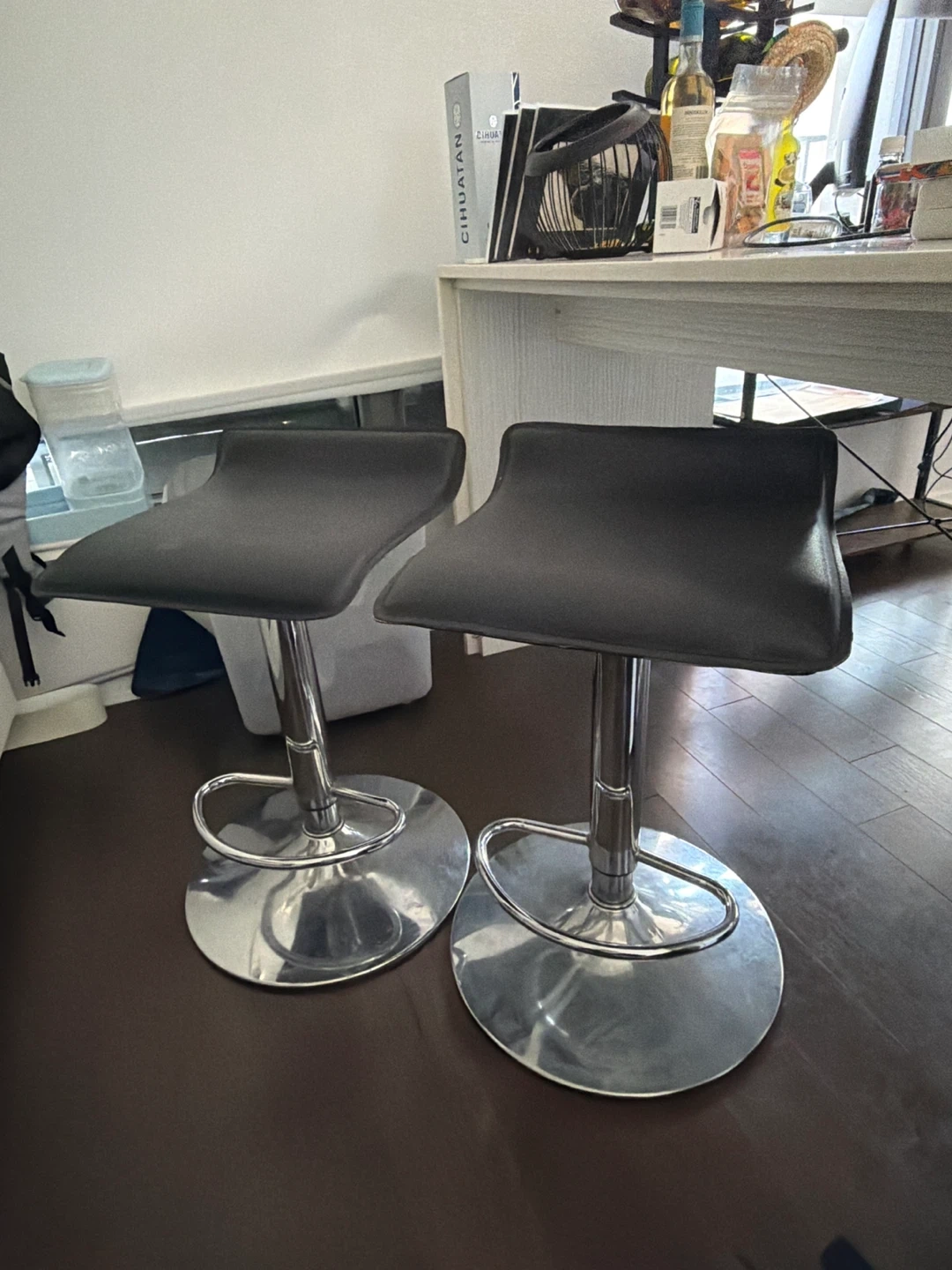 This is a set of two black bar stools. They feature adjustable height and a chrome base. Perfect for a kitchen island or home bar!